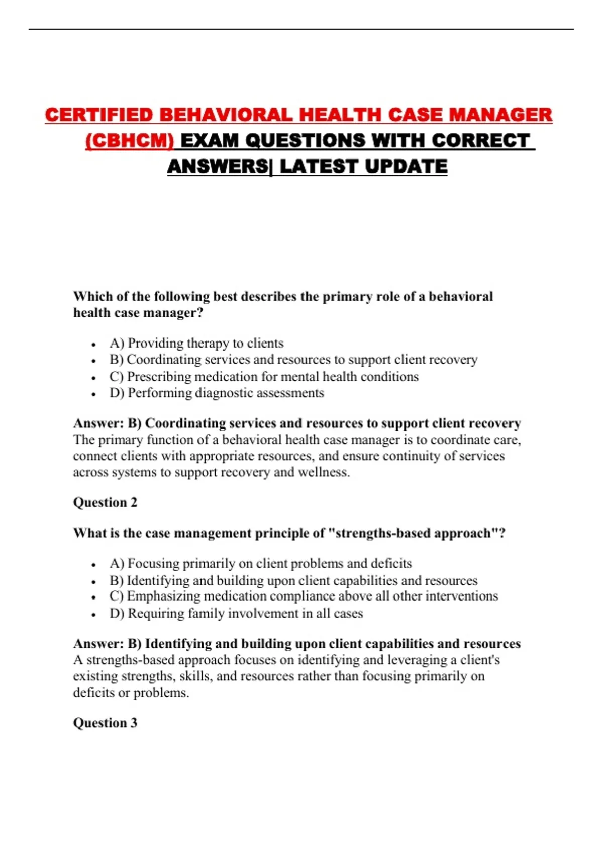 CERTIFIED BEHAVIORAL HEALTH CASE MANAGER (CBHCM) EXAM QUESTIONS WITH CORRECT ANSWERS| LATEST UPDATE
