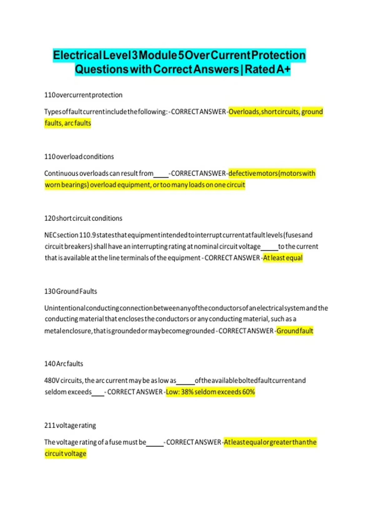 Electrical Level 3 Module 5 Over Current Protection Questions with Correct Answers Rated A+