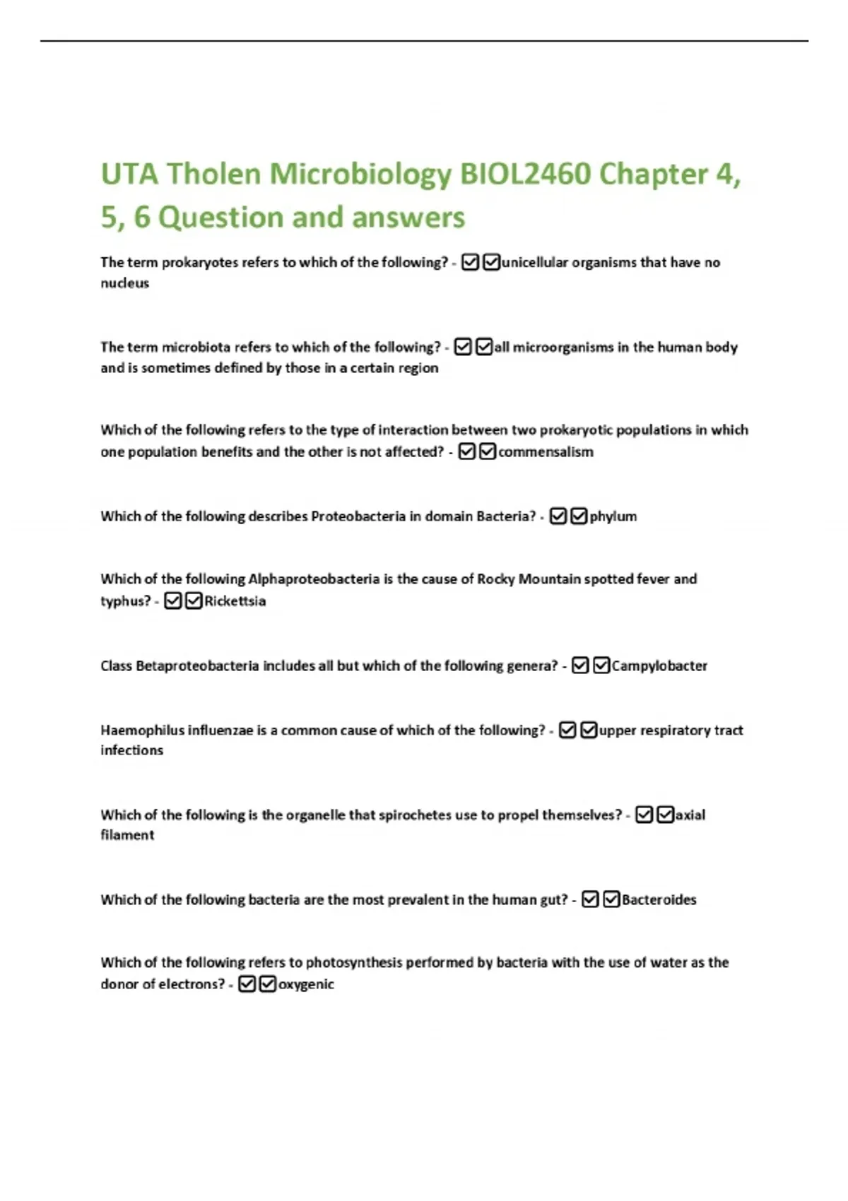 UTA Tholen Microbiology BIOL2460 Chapter 4, 5, 6 Question and answers The term prokaryotes refers to which of the following? - unicellular organisms that have no nucleus The term microbiota refers to which of the following? - all microorganisms in the human body and is sometimes defined by those in a certain region Which of the following refers to the type of interaction between two prokaryotic populations in which one population benefits and the other is not affected? - commensalism Which of the following describes Proteobacteria in domain Bacteria? - phylum Which of the following Alphaproteobacteria is the cause of Rocky Mountain spotted fever and typhus? - Rickettsia