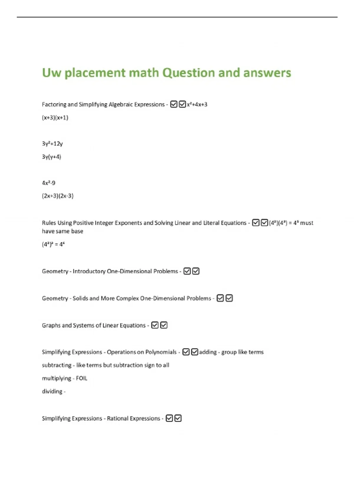 Uw placement math Question and answers Factoring and Simplifying Algebraic Expressions - x²+4x+3 (x+3)(x+1) 3y²+12y 3y(y+4) 4x²-9 (2x+3)(2x-3) Rules Using Positive Integer Exponents and Solving Linear and Literal Equations - (4²)(4³) = 4⁵ must have same base (4²)³ = 4⁶ Geometry - Introductory One-Dimensional Problems - Geometry - Solids and More Complex One-Dimensional Problems -