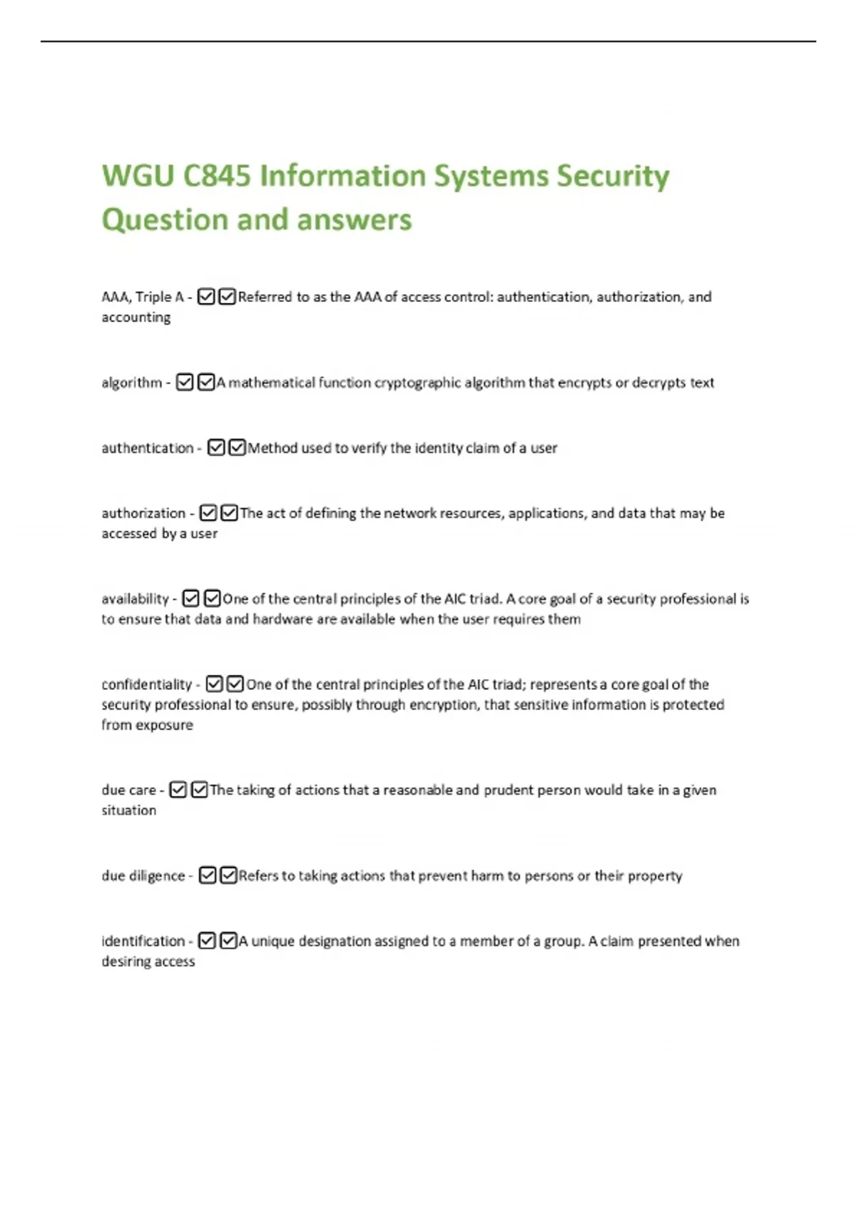 WGU C845 Information Systems Security Question and answers AAA, Triple A - Referred to as the AAA of access control: authentication, authorization, and accounting algorithm - A mathematical function cryptographic algorithm that encrypts or decrypts text authentication - Method used to verify the identity claim of a user authorization - The act of defining the network resources, applications, and data that may be accessed by a user