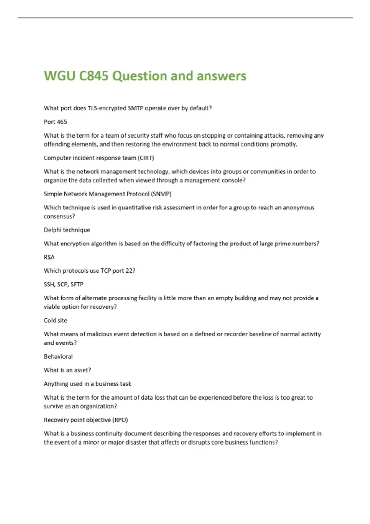 WGU C845 Question and answers What port does TLS-encrypted SMTP operate over by default? Port 465 What is the term for a team of security staff who focus on stopping or containing attacks, removing any offending elements, and then restoring the environment back to normal conditions promptly. Computer incident response team (CIRT) What is the network management technology, which devices into groups or communities in order to organize the data collected when viewed through a management console? Simple Network Management Protocol (SNMP) Which technique is used in quantitative risk assessment in order for a group to reach an anonymous consensus? Delphi technique