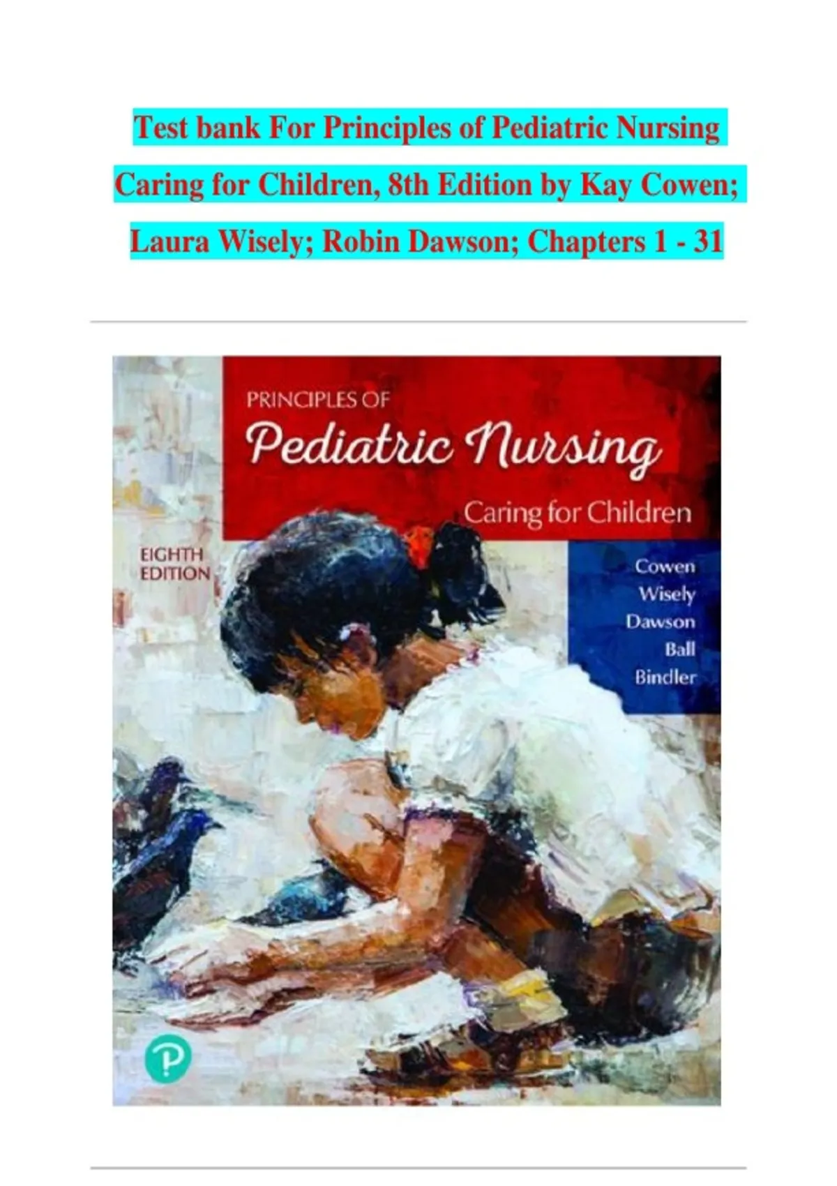 Boost your Pediatric Nursing exam confidence with this complete Test Bank! This Principles of Pediatric Nursing: Caring for Children 8th Edition Test Bank by Kay Cowen, Laura Wisely & Robin Dawson is an exam-focused question bank designed to help you master key concepts and pass with confidence. 100% Guaranteed Pass — Proven to support effective study and revision Fully Updated for 2026 — Aligned with the latest edition and current exam trends Comprehensive Coverage — Includes multiple-choice, case questions, and rationales Perfect for: Final exams, quizzes, NCLEX prep, and course assessments This test bank is ideal for students and nursing professionals looking for trusted, high-quality exam preparation material. Download now and take a confident step toward success!
