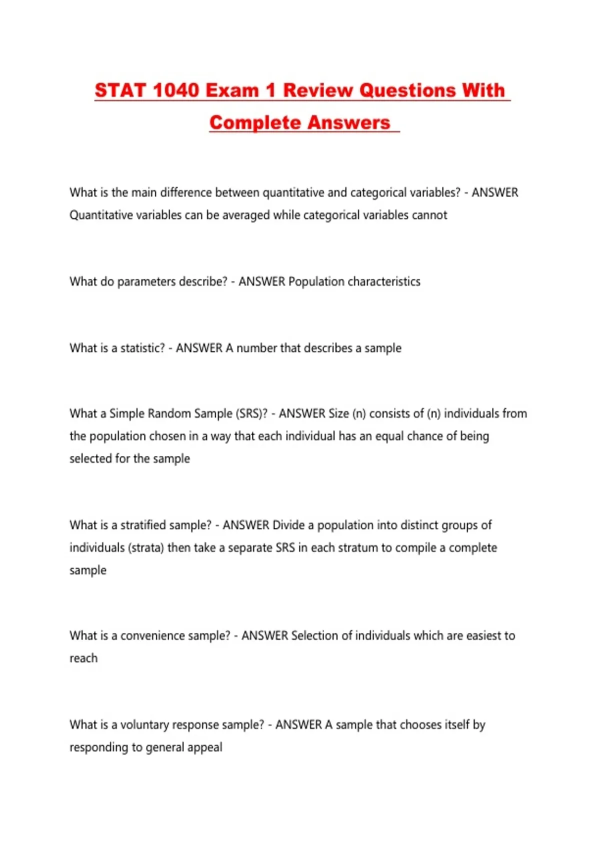 STAT 1040 Exam 1 Review Questions With