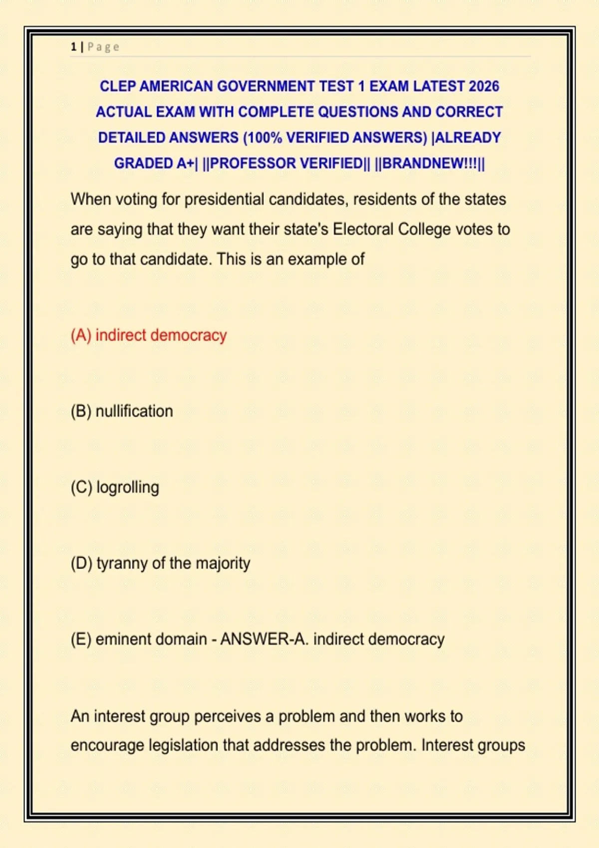 CLEP AMERICAN GOVERNMENT TEST 1 EXAM LATEST 2026