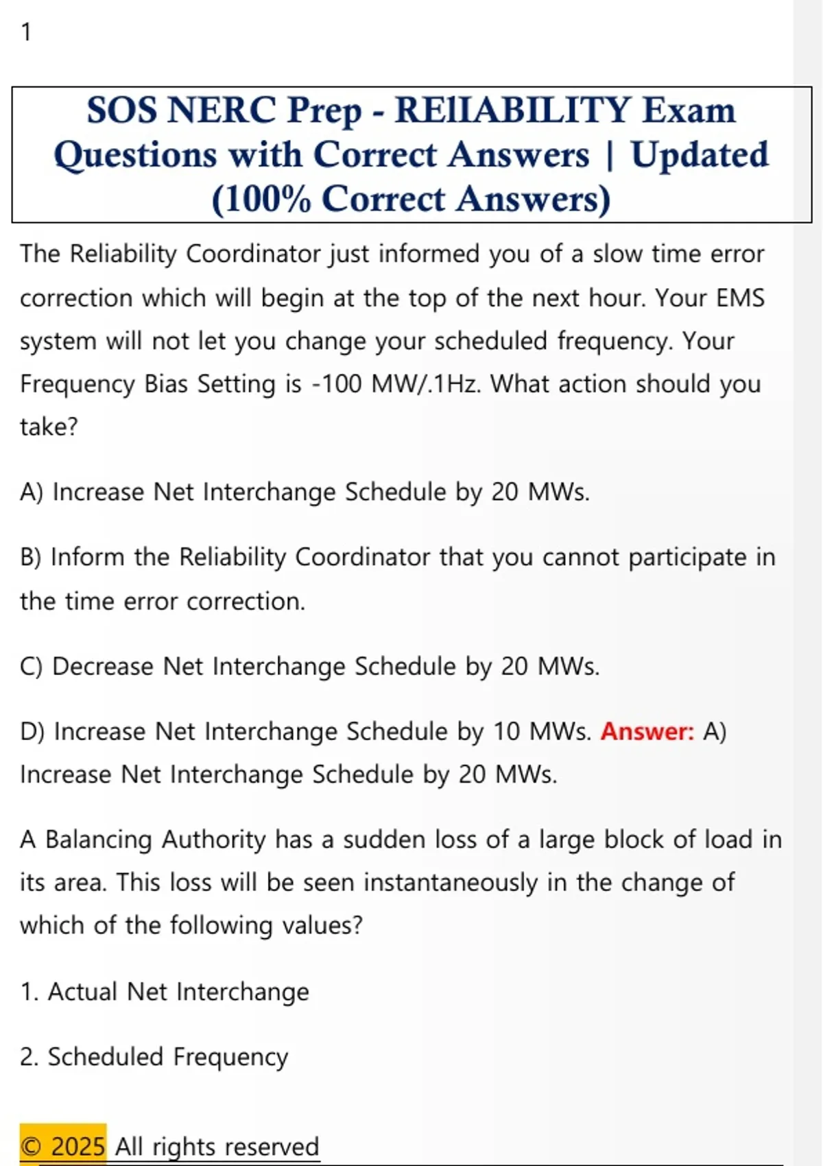 SOS NERC Prep - RElIABILITY Exam