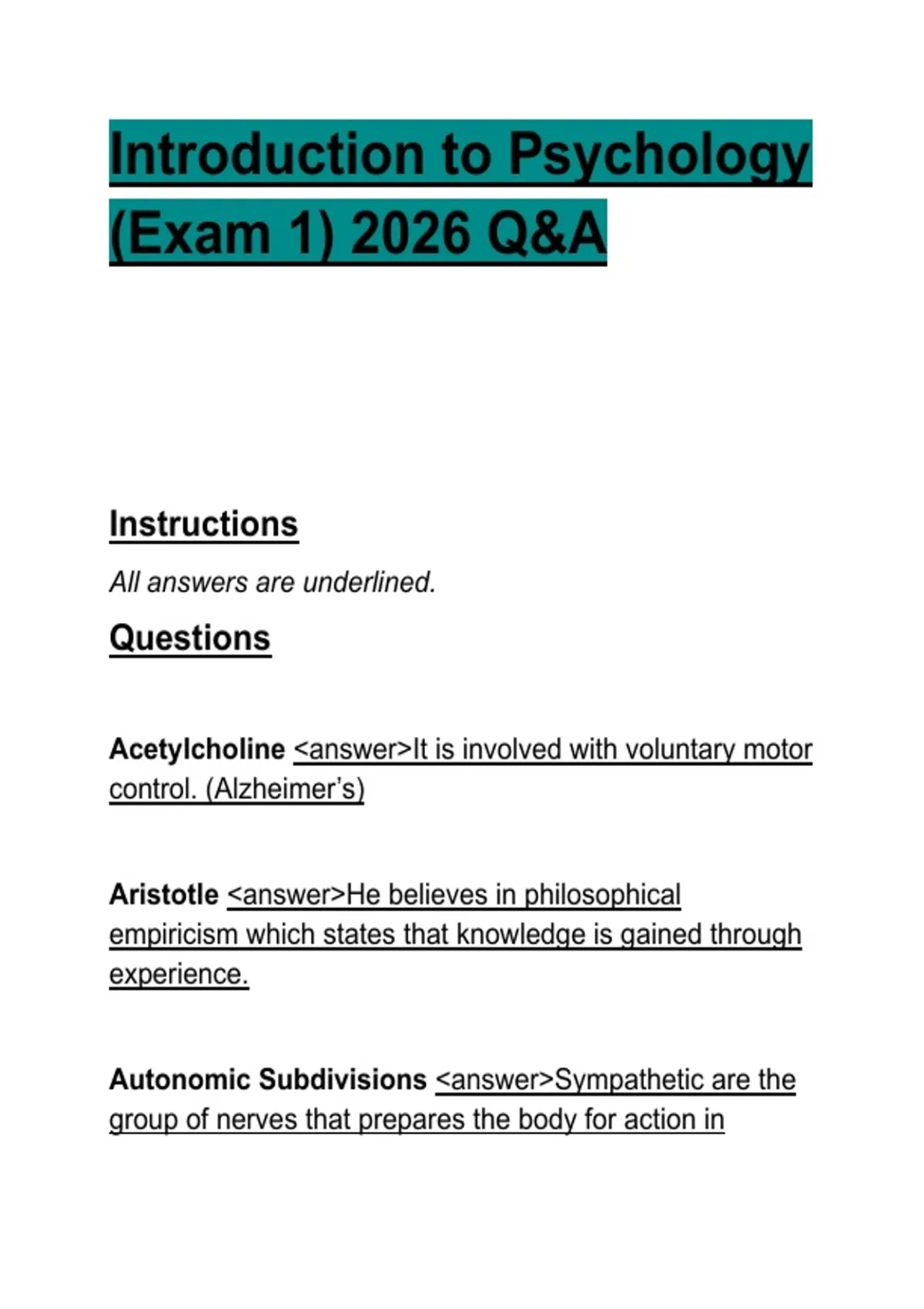 This document contains a comprehensive set of questions and underlined answers covering key topics from Exam 1 of Introduction to Psychology. It includes foundational concepts such as major psychological theories, neurotransmitters, brain structures, research methods, ethics, consciousness, and historical figures in psychology. The material is well-suited for exam review, concept clarification, and last-minute studying for introductory psychology courses in 2026.