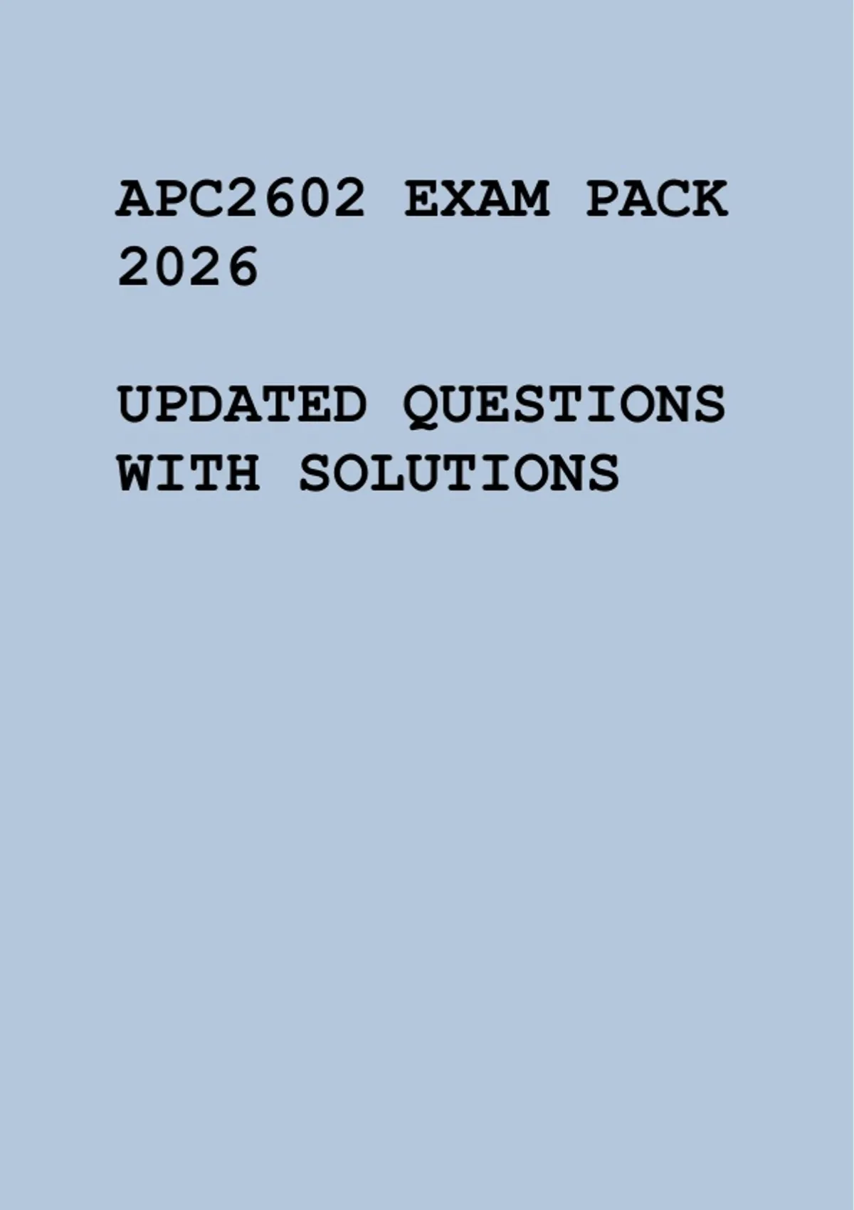 This document contains an updated APC2602 exam pack for the 2026 assessment period, featuring exam-style questions with clear and accurate solutions. It is designed to support focused revision and exam preparation by covering key course topics and commonly tested concepts.