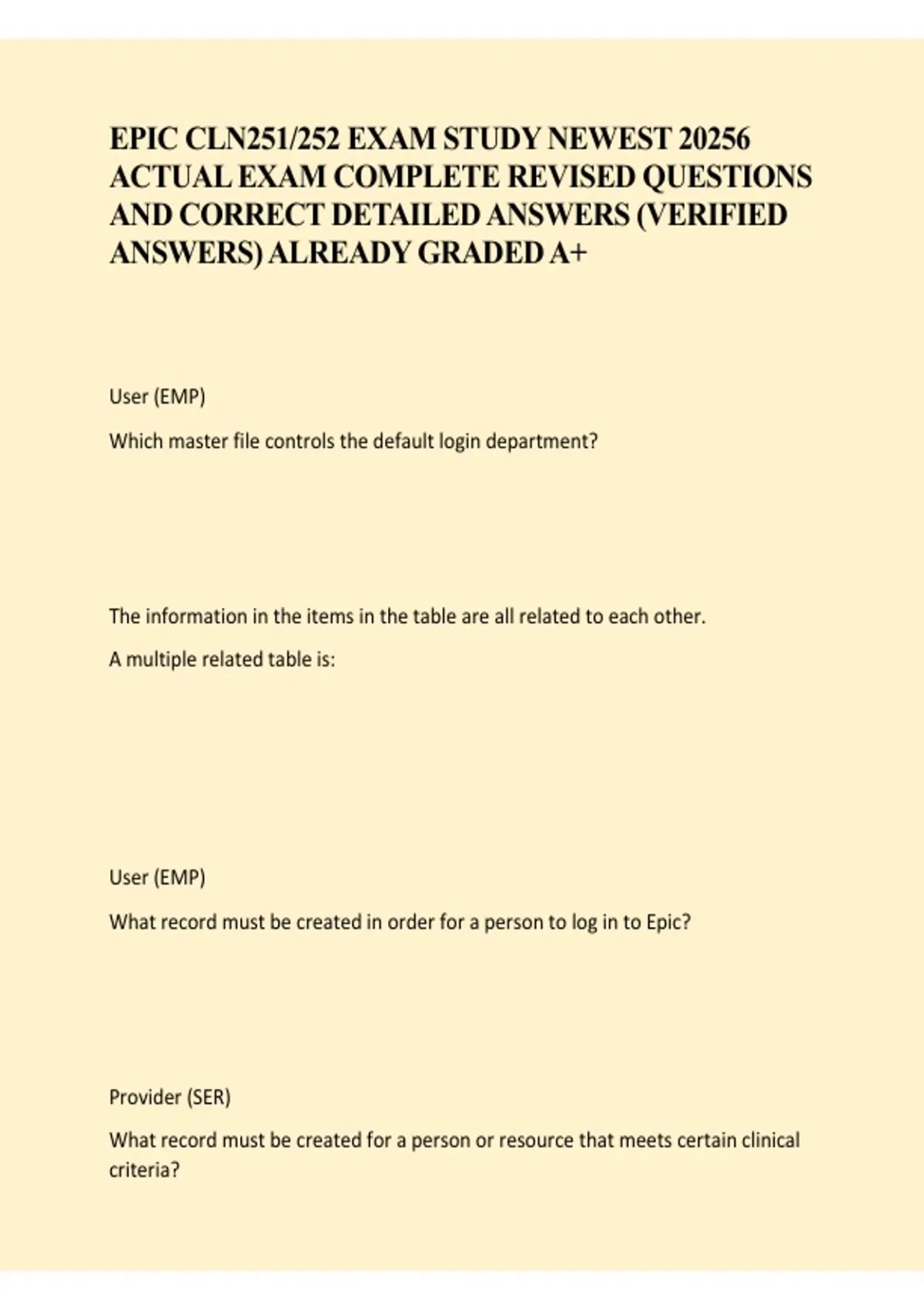 Prepare with EPIC CLN251–252 Exam Study – Newest 2025/6, Actual Exam Complete Revised Questions, featuring verified questions and answers. This resource covers clinical workflows, EMR documentation, patient care scenarios, and decision-making in the EPIC system, providing clear rationales to help nursing students and professionals master EPIC CLN skills and confidently succeed in exams.