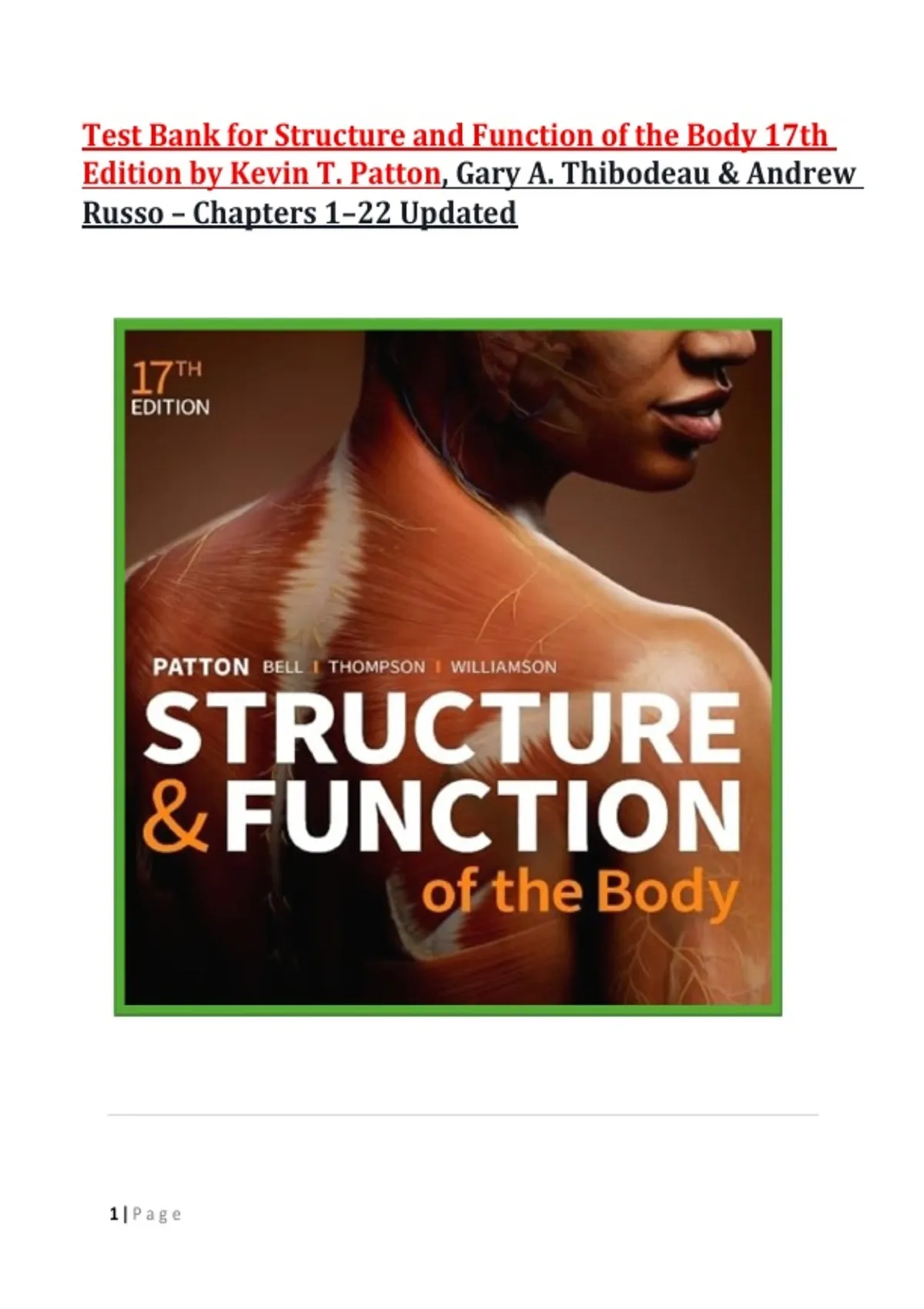 Test Bank for Structure and Function Of The Body 17th Edition by Kevin T. Patton, Chapters 1- 22. he Test Bank for Structure and Function of the Body, 17th Edition by Kevin T. Patton, Gary A. Thibodeau, and Andrew Russo (Chapters 1–22, Updated for 2025/2026) provides an extensive collection of exam-style questions with correct answers and rationales. Covering key anatomy and physiology concepts—such as body organization, tissues, organ systems, metabolism, and homeostasis—this resource is designed to strengthen foundational A&P knowledge. Ideal for nursing, medical, and allied health students, this updated test bank aligns with the latest course content and supports preparation for ATI, HESI, and NCLEX exams, ensuring success in both classroom and clinical assessments.