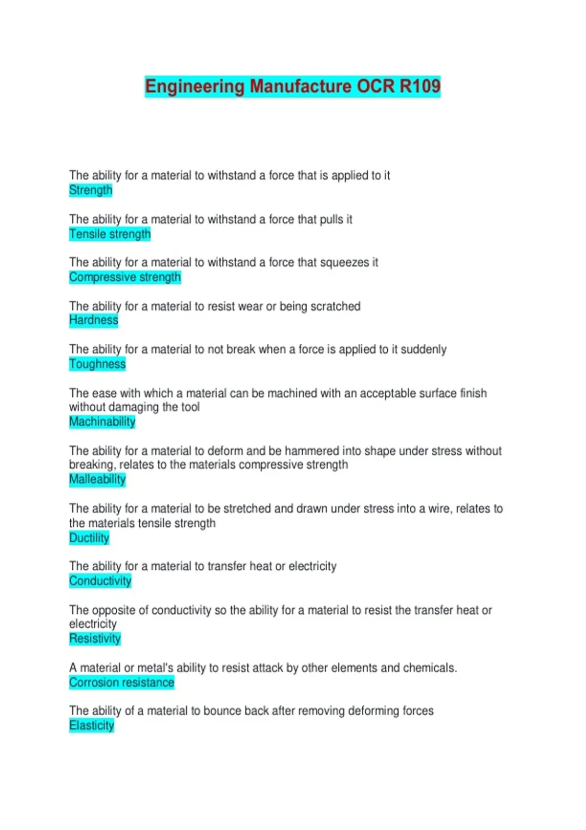 Engineering Manufacture OCR R109 | Questions with Verified Answers The ability for a material to withstand a force that is applied to it Strength The ability for a material to withstand a force that pulls it Tensile strength The ability for a material to withstand a force that squeezes it Compressive strength The ability for a material to resist wear or being scratched Hardness The ability for a material to not break when a force is applied to it suddenly Toughness The ease with which a material can be machined with an acceptable surface finish without damaging the tool Machinability The ability for a material to deform and be hammered into shape under stress without breaking, relates to the materials compressive strength Malleability The ability for a material to be stretched and drawn under stress into a wire, relates to the materials tensile strength Ductility The ability for a material to transfer heat or electricity Conductivity The opposite of conductivity so the ability for a material to resist the transfer heat or electricity Resistivity A material or metal's ability to resist attack by other elements and chemicals. Corrosion resistance The ability of a material to bounce back after removing deforming forces Elasticity The ability for a material to acquire permanent deformation after the removal of a force, it happens when the object loses elasticity Plasticity A metal that contains iron, is usually silvery-grey in colour, is prone to rusting and corrosion and is magnetic (except stainless steel) Ferrous metal A metal that does not contain iron, has good corrosion resistance but does tarnish and is non-magnetic Non-ferrous metal A mixture of two or more metallic elements which gives enhanced properties Alloy A shiny, soft, malleable, ductile and strong metal and used to make steels and girders Iron Ductile, malleable, prone to rusting Used to make car bodies, girders, gates Mild Steel (Low carbon steel) Hard, strong Used for hand tools like screwdrivers and hammers High carbon steel Resistant to corrosion, does not rust, with chromium Used for cutlery, kitchen sinks, surgical instruments Stainless steel Resistant to wear but brittle Used for drill bits, lathe cutting tools High-speed steel Molten impure iron from blast furnace for moulds, good compressive strength but brittle Used for brake discs, machine bases, vices, manhole covers, engine blocks Cast iron Ductile, malleable, excellent conductor, reddish brown, corrosion resistant Used for pipes, wire, cookware Copper Well cast and good machinability, corrosion resistant, conducts heat well, alloy of copper and zinc Used for musical instruments, screws, water fittings Brass Hard, brittle, very corrosion resistant, copper and tin Used for statues, coins, bearings, underwater fittings Bronze Lightweight, malleable, ductile, good corrosion resistance, good conductivity, low density, common Used for aircraft bodies, drinks cans, cooking foil, window frames Aluminium alloys Resistant to corrosion but weak by itself so used for galvanising to make other material corrosion resistant Zinc Ductile, malleable, resistant to corrosion Used for tin-plating for steel food cans against corrosion Tin Soft, dense, malleable, tarnishes Batteries, x-ray shielding, weights, roofing Lead Lightweight, strong, corrosion resistant Used for drill bits, bikes, aircraft Titanium Alloy of lead and tin, low melting points Used for plumbing, joining electronic components Solder Polymers that can be softened by heating Thermoplastics Polymers that cannot be remelted as they have cross-links between layers Thermosetting polymers Tough, corrosion resistant, impact resistant, low melting point Used for toys, protective headgear, canoes Acrylonitrile Butadiene Styrene (ABS) HDPE is strong, stiff Used for pipes, buckets, bowels LDPE is flexible, soft, tough Used for plastic bags, plastic film Polyethylene Light, strong, resistive Used for vacuum forming in school, packaging High Impact Polystyrene (HIPS) Stiff, hard-wearing Used for pipes, electrical cable jackets, packaging Polyvinyl Chloride (PVC) Strong, elastic, tough, lightweight, colourfast, durable Used for clothing, carpets, sportswear, upholstery Nylon Low density, tough, flexible Used for ropes, carpets, packaging Polypropelene Strong, stiff, hard, tough, transparent, heat and impact resistant Used for eyewear, bullet-proof glass Polycarbonate Insulator, stiff, hard, brittle if not reinforced with glass fibre to form GRP Used for car bodies, boats Polyester resin Hard, strong, stiff, insulator, brittle Used for plug sockets, electrical switches, door handles Urea formaldehyde Resin with hardener, hard, brittle if not reinforced, corrosion resistant Used for printed circuit boards, epoxy adhesives Epoxy resin Very good heat resistance, very dark, hard, quite brittle Used for saucepan handles, electrical fittings, adhesives Phenol Formaldehyde Refractory, inorganic and nonmetallic material made from clay and other cominations of minerals baked at high temperatures Ceramics Hard, abrasion resistant, high melting point Used for cutting tool tips, jewellery Tungsten carbide Heat resistant, transparent, corrosion resistant Jars, glasses, window panes Glass Silicon nitride, low conductivity, high heat resistance Ceramic bearing material Strong, lightweight, insulator Used for water tanks, surfboards, boats Glass reinforced plastic (GRP) A material that combines two or more different materials to make one with better properties Composite Strong, stiff, lightweight, conductor Used for aircraft, racecars, bicycle frames Carbon fibre Strong, durable Used for buildings, bridges, roads, dams, kerbs Concrete Materials that change in properties in response to stimuli Smart materials definition Shape memory alloys are metals that when deformed, can spring back into its original shape with heat. Used for fire alarm systems, and nitinol for stents, dental braces Shape-memory alloys Materials or inks that change colour in