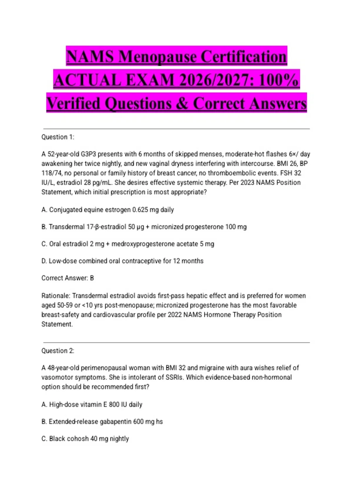 NAMS Menopause Certification ACTUAL EXAM 2026/2027: 100% Verified Questions & Correct Answers
