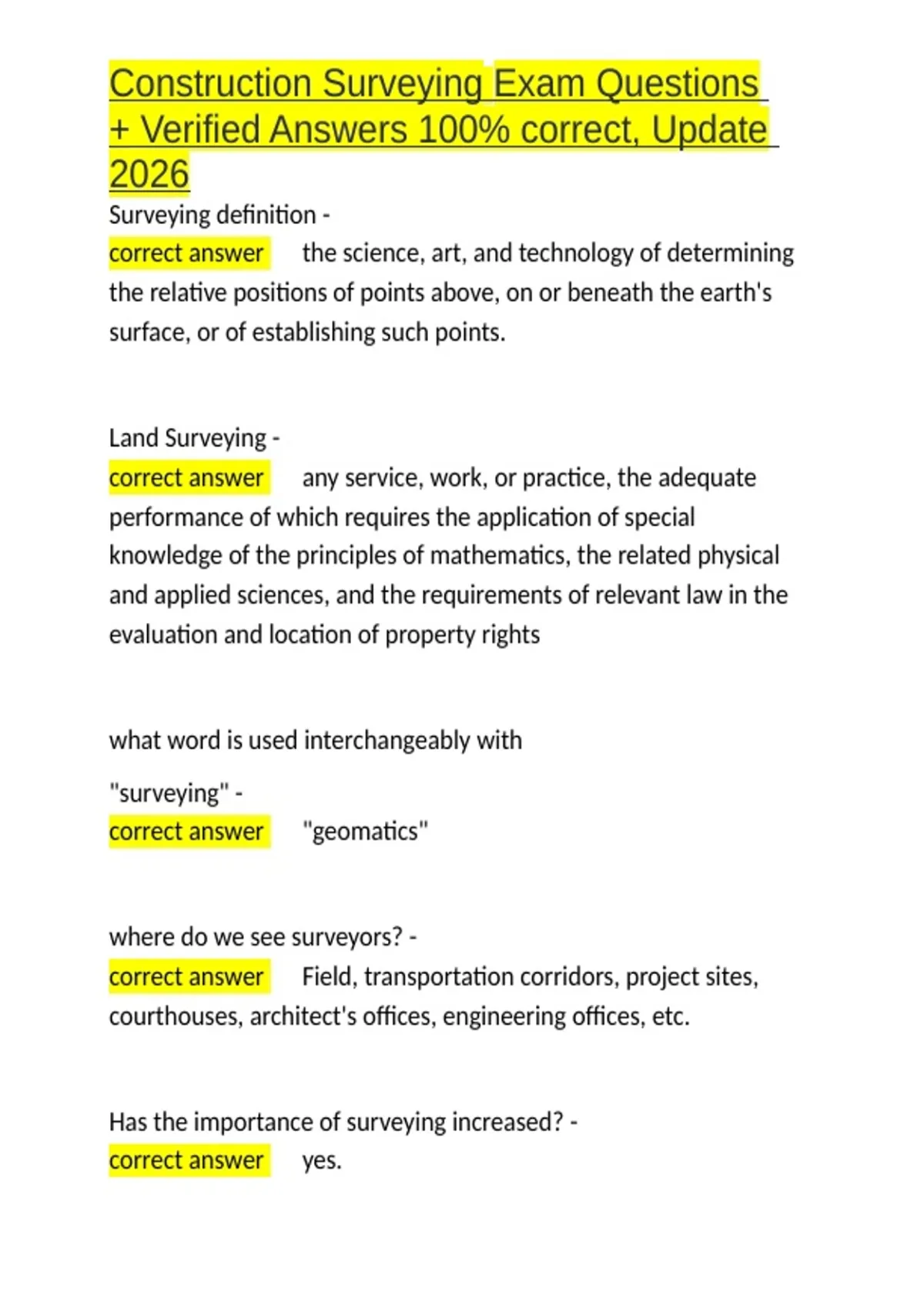 Construction Surveying Exam Questions + Verified Answers 100- correct, Update 2026.docx