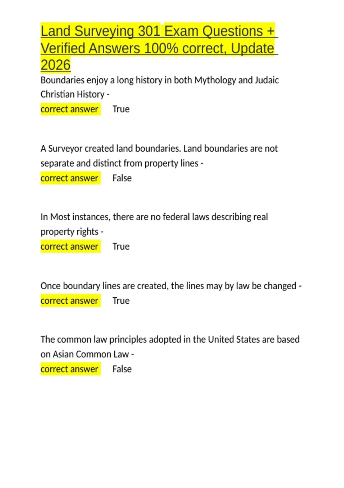 Land Surveying 301 Exam Questions + Verified Answers 100- correct, Update 2026.docx