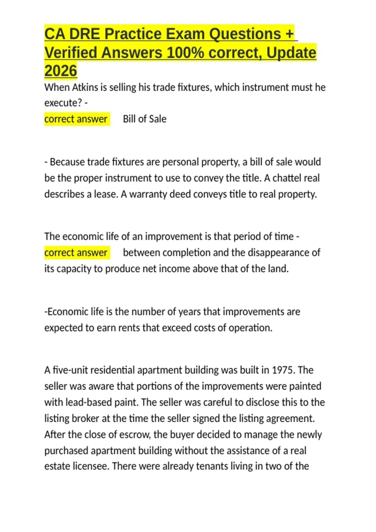 CA DRE Practice Exam Questions + Verified Answers 100- correct, Update