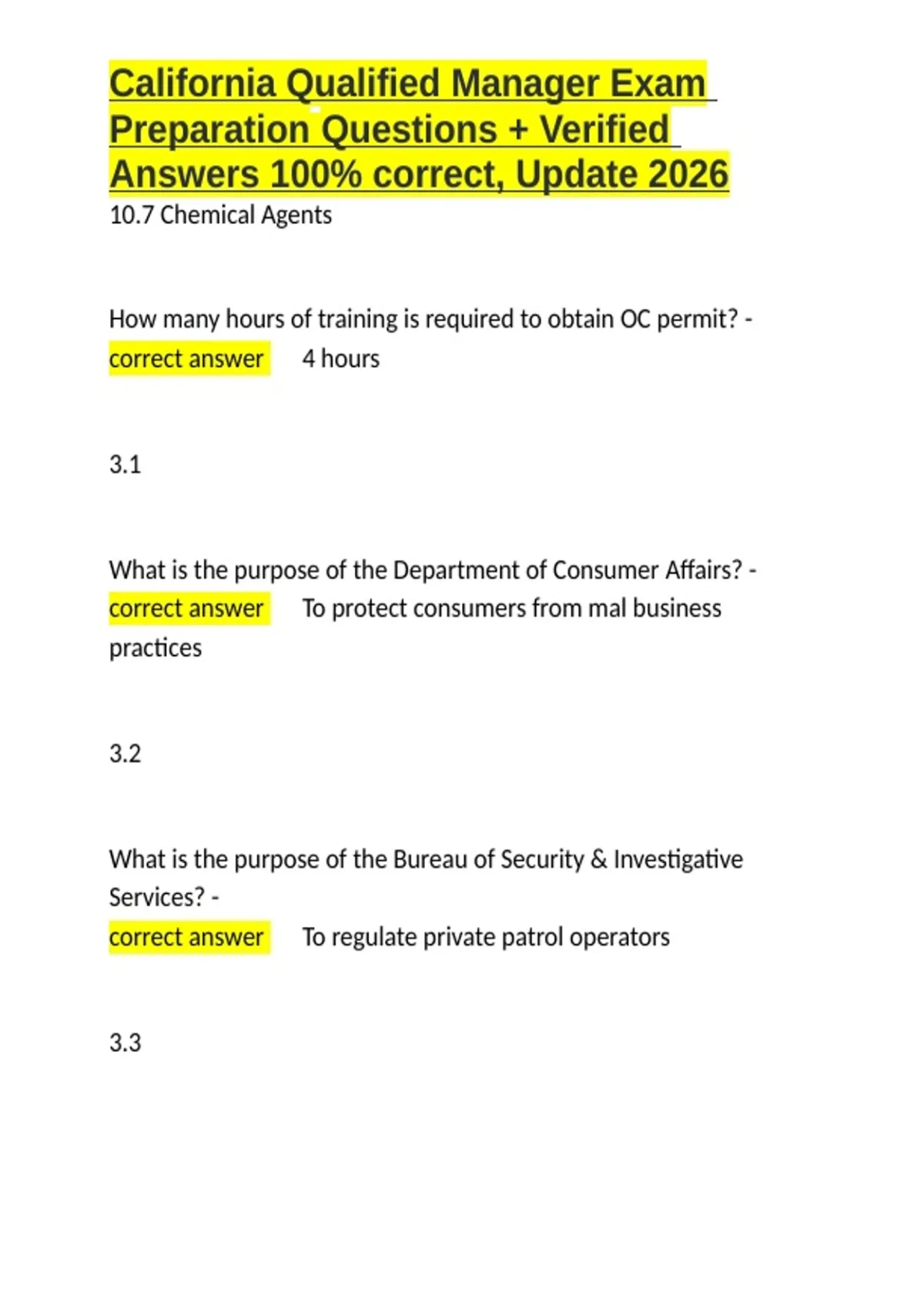 California Qualified Manager Exam Preparation Questions + Verified Answers 100- correct, Update 2026.docx