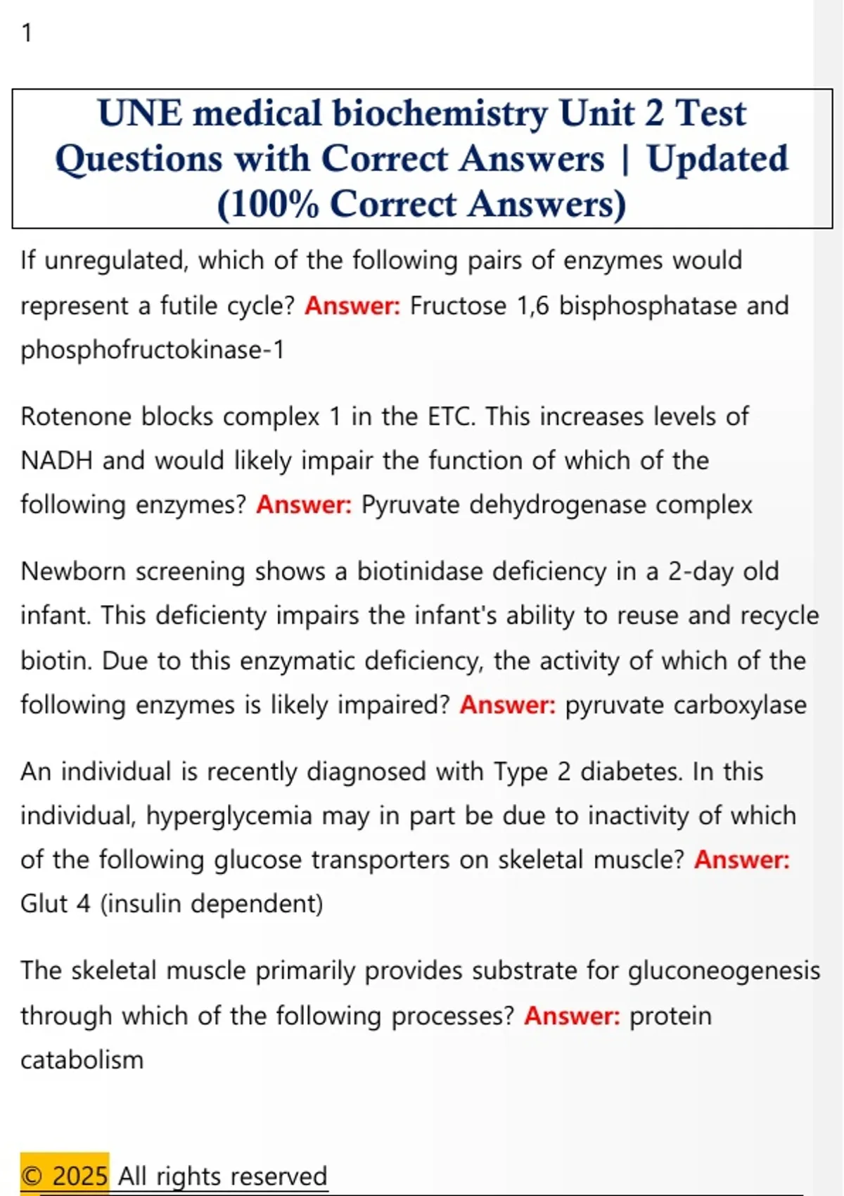 UNE medical biochemistry Unit 2 Test Questions with Correct Answers | Updated (100% Correct Answers)