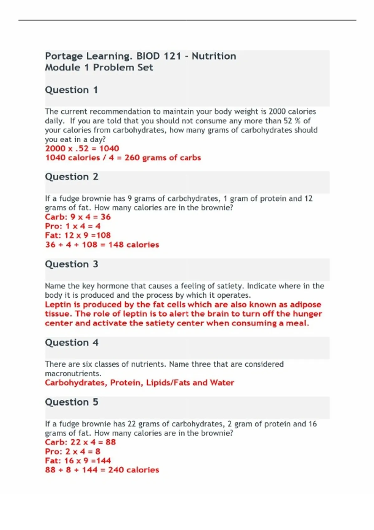 Portage Learning BIOD 121 Nutrition | Module 1 Problem Set | 2026 Verified Q&A