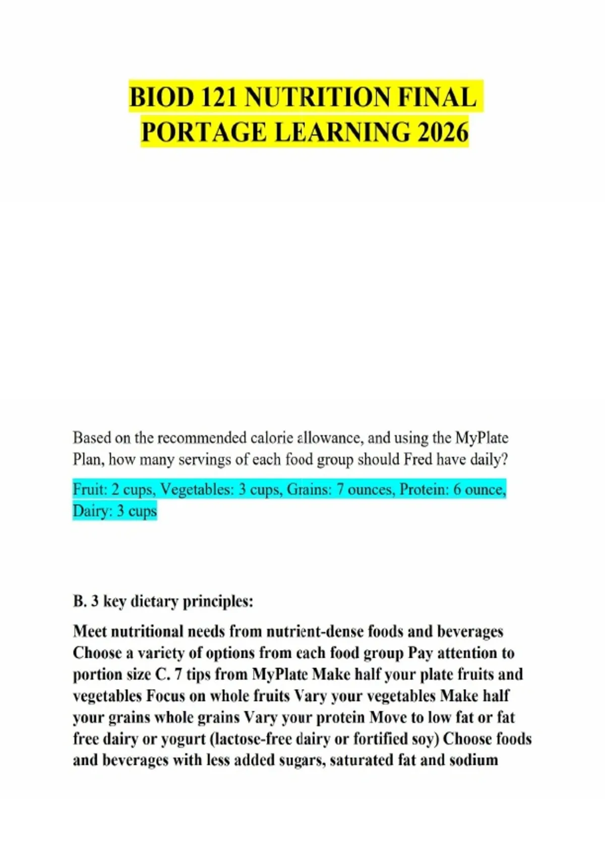Prepare for your proctored finale with this 2026 verified final exam bank for Portage Learning BIOD 121 Nutrition. This resource provides a comprehensive map of the course's most critical concepts, from the neurobiology of the hypothalamus in appetite regulation to the exact endocrine functions of Leptin and Ghrelin. You will gain technical mastery over advanced metabolic math, including fat-gram calculations based on percentage-of-calorie targets. The guide provides surgical detail on the ABCDEs of nutritional assessment and the MyPlate framework, ensuring you can accurately plan daily servings for all food groups. From identifying clinical markers of malnutrition to understanding the specific roles of accessory organs like the pancreas and liver, this toolkit is the definitive study aid for nursing students aiming for a top-tier grade.