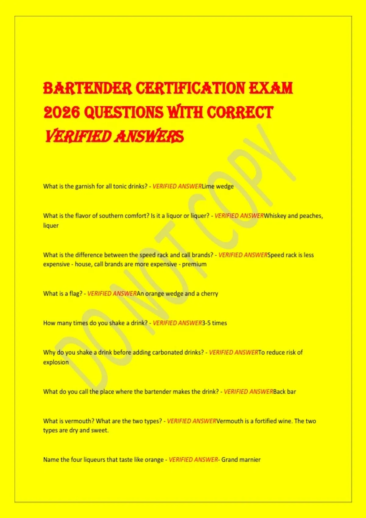 BARTENDER CERTIFICATION EXAM 2026 QUESTIONS WITH CORRECT VERIFIED ANSWERS