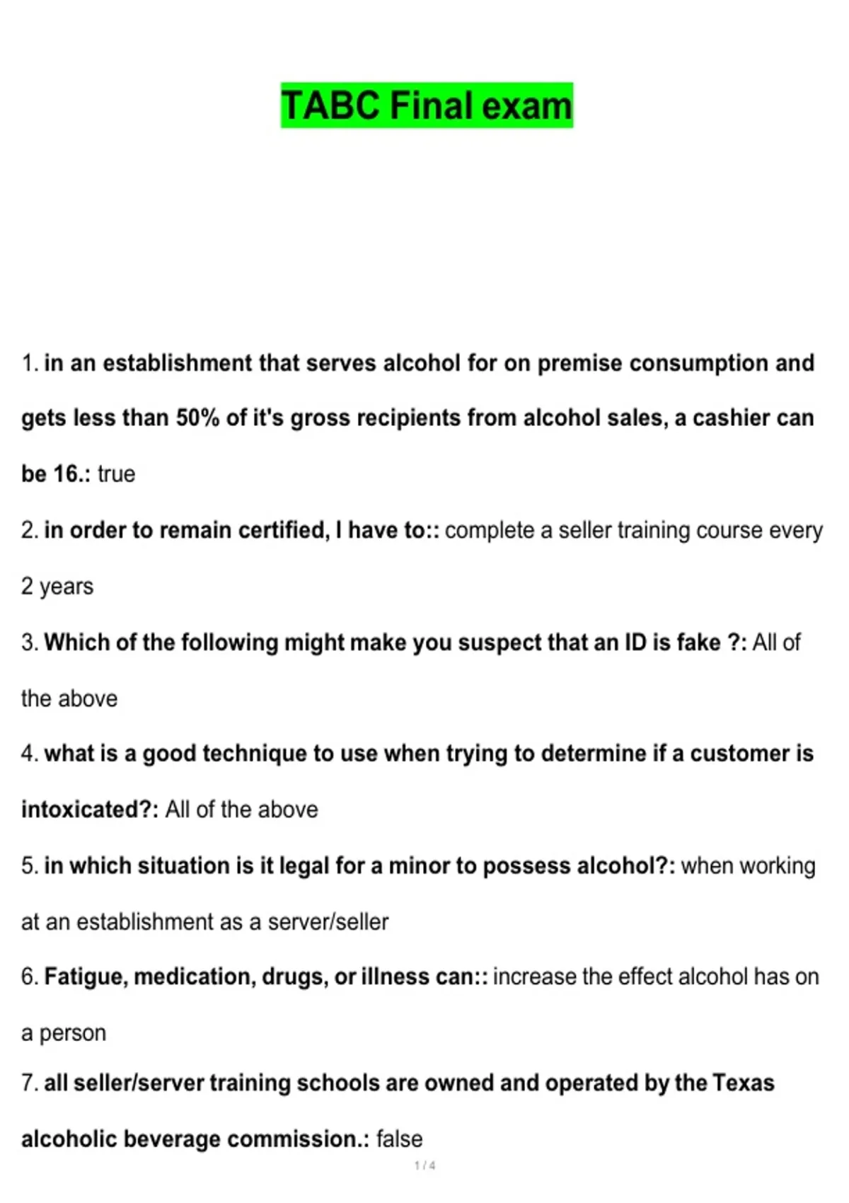 This document provides exam-style questions with correct and verified answers to support preparation for the TABC final exam. It covers alcohol service laws, compliance requirements, age verification, and responsible beverage service standards.