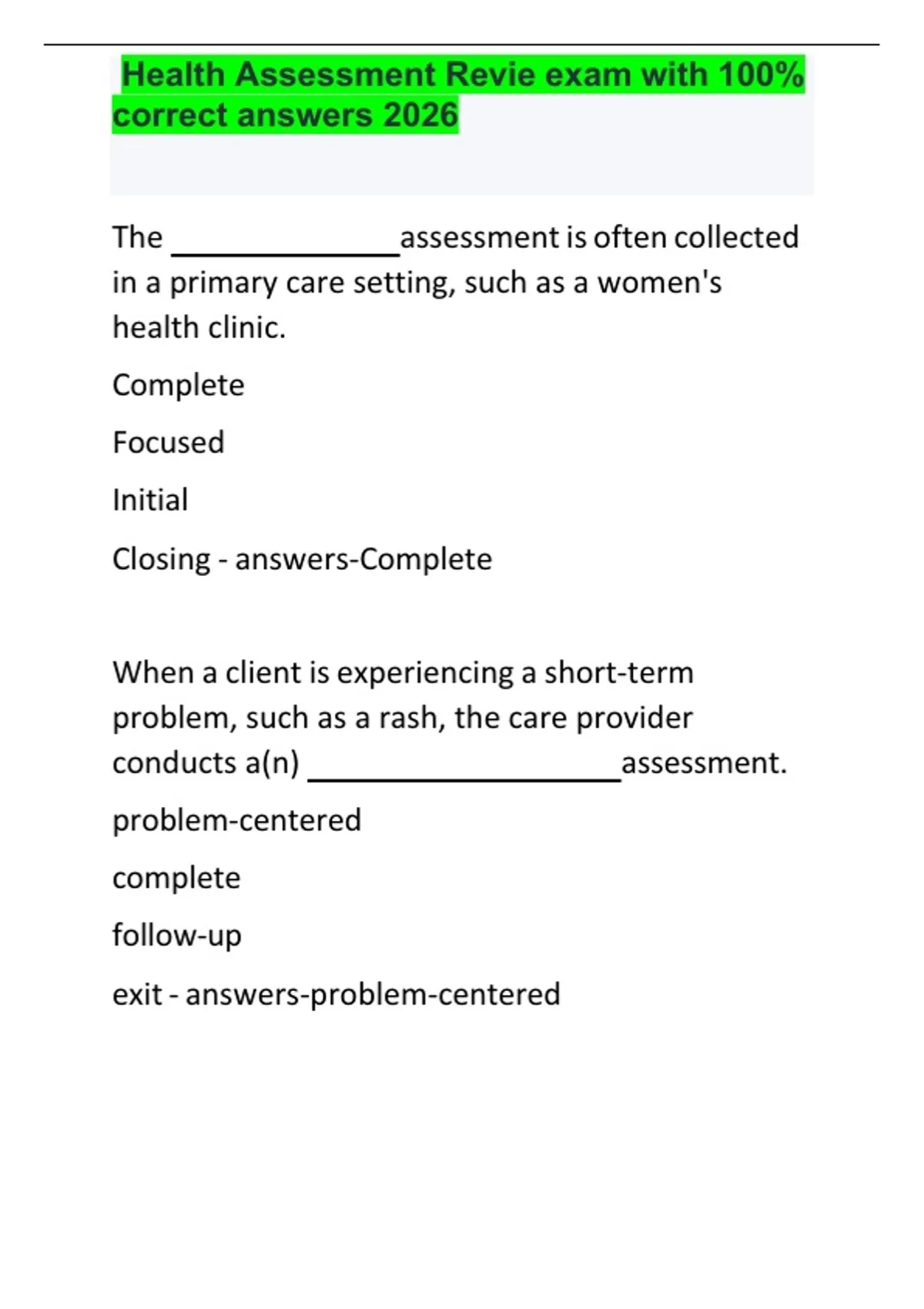This document contains health assessment review exam questions with fully correct and verified answers designed for the 2026 exam cycle. It covers comprehensive and focused health assessments, diagnostic reasoning, and clinical examination techniques to support effective exam preparation.