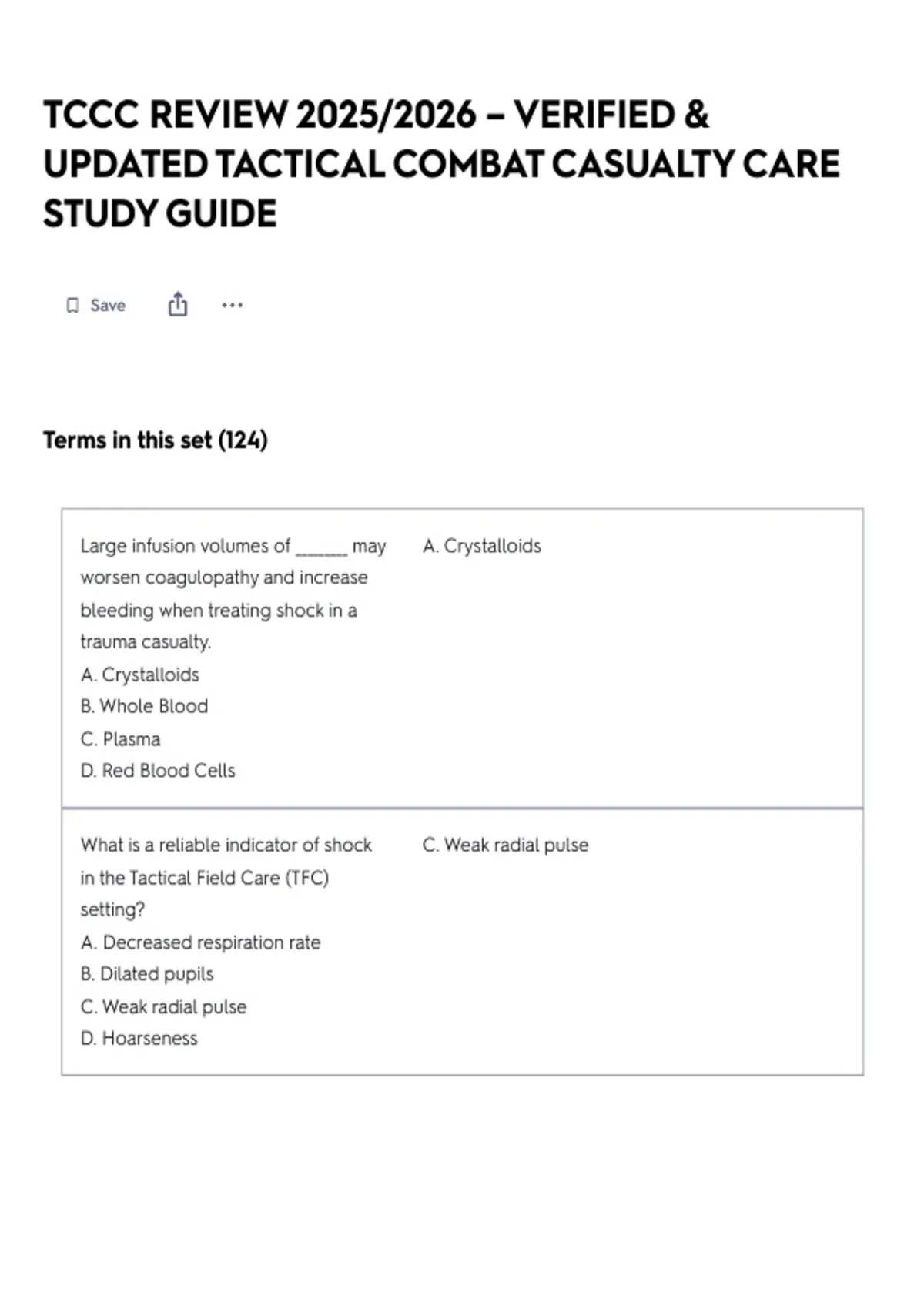 TCCC REVIEW 2025/2026 – VERIFIED & UPDATED TACTICAL COMBAT CASUALTY CARE STUDY GUIDE