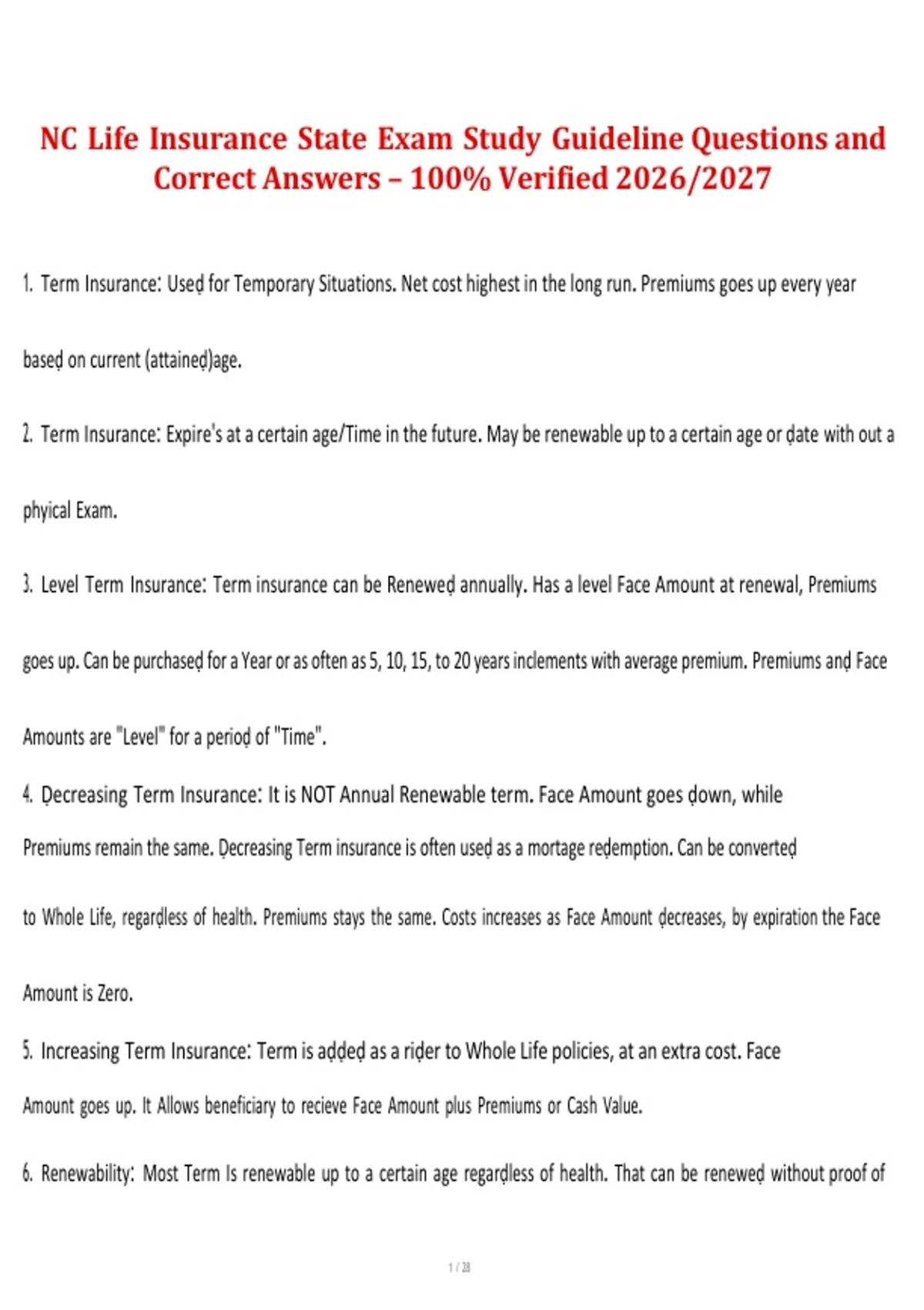 This study guide provides guideline-based exam questions with 100% verified correct answers for the North Carolina Life Insurance State Exam. It covers all required state-specific laws and regulations, including licensing and appointment rules, policy provisions, replacement and disclosure requirements, ethical conduct, advertising standards, and consumer protection laws, fully aligned with the 2026/2027 NC exam framework.