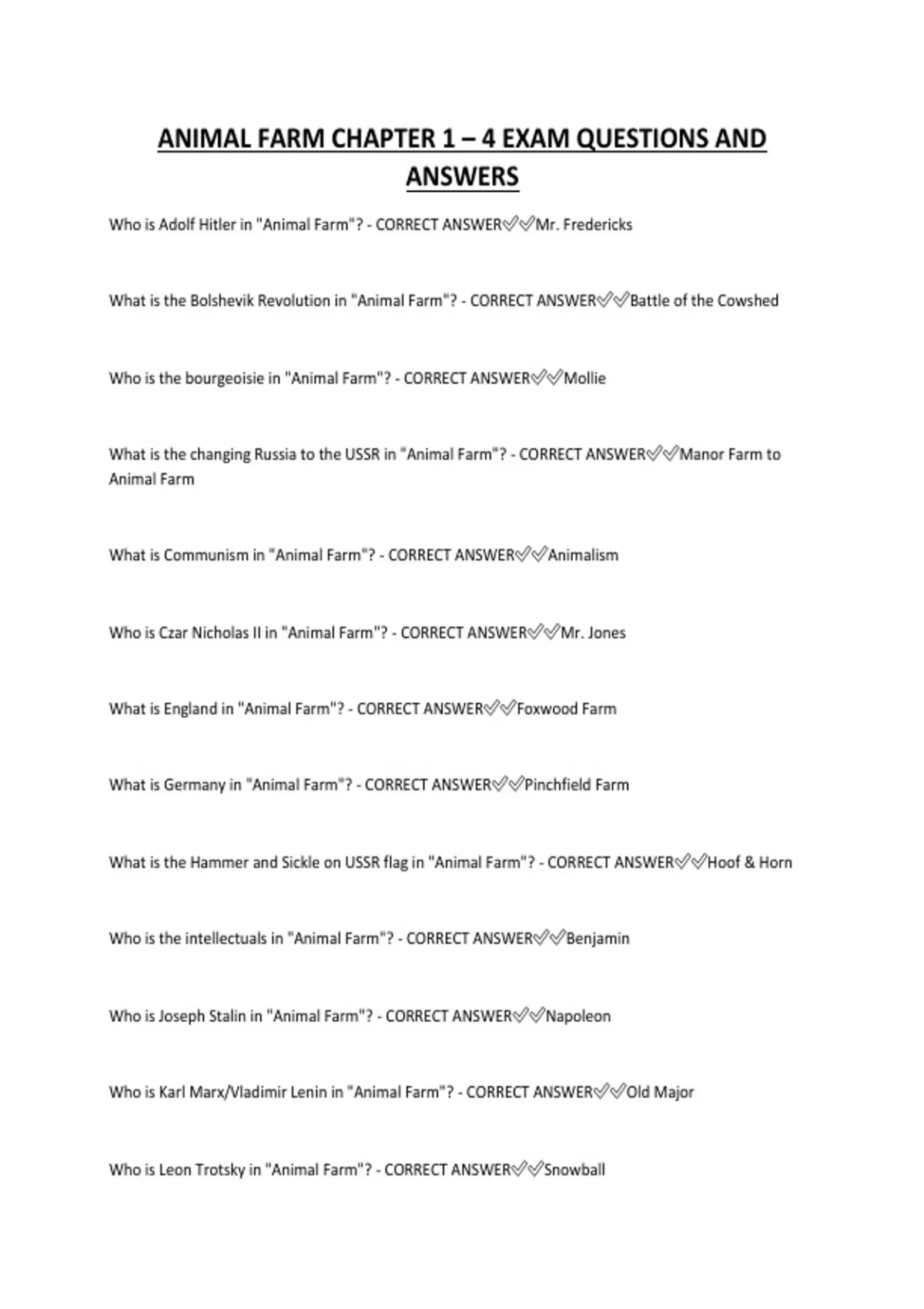 ANIMAL FARM CHAPTER 1 – 4 EXAM QUESTIONS AND ANSWERS Who is Adolf Hitler in "Animal Farm"? - CORRECT ANSWERMr. Fredericks