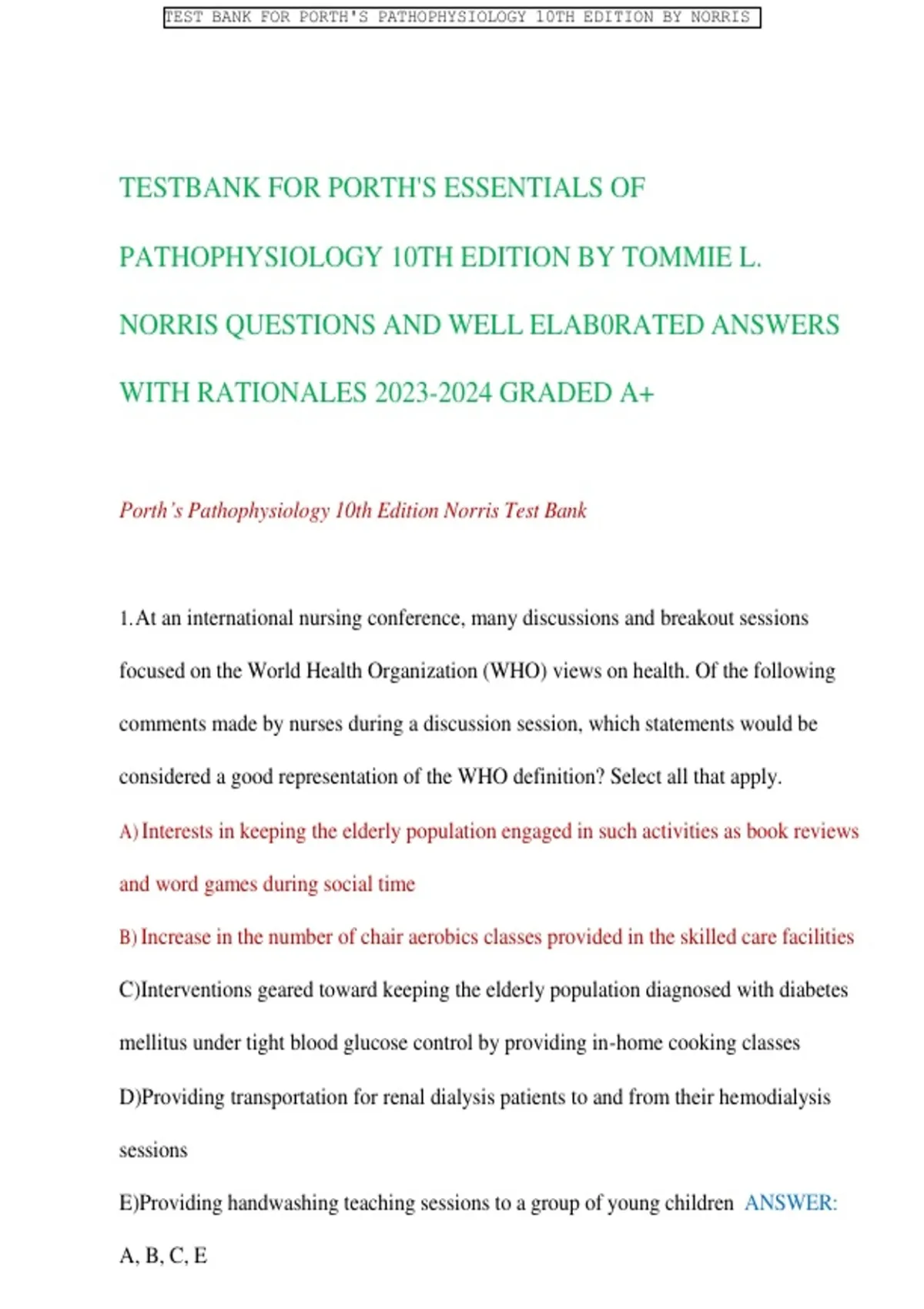 TESTBANK FOR PORTH'S ESSENTIALS OF PATHOPHYSIOLOGY 10TH EDITION BY TOMMIE L. NORRIS QUESTIONS AND WELL ELAB0RATED ANSWERS WITH RATIONALES GRADED A+TESTBANK FOR PORTH'S ESSENTIALS OF PATHOPHYSIOLOGY 10TH EDITION BY TOMMIE L. NORRIS QUESTIONS AND WELL ELAB0RATED ANSWERS WITH RATIONALES GRADED A+