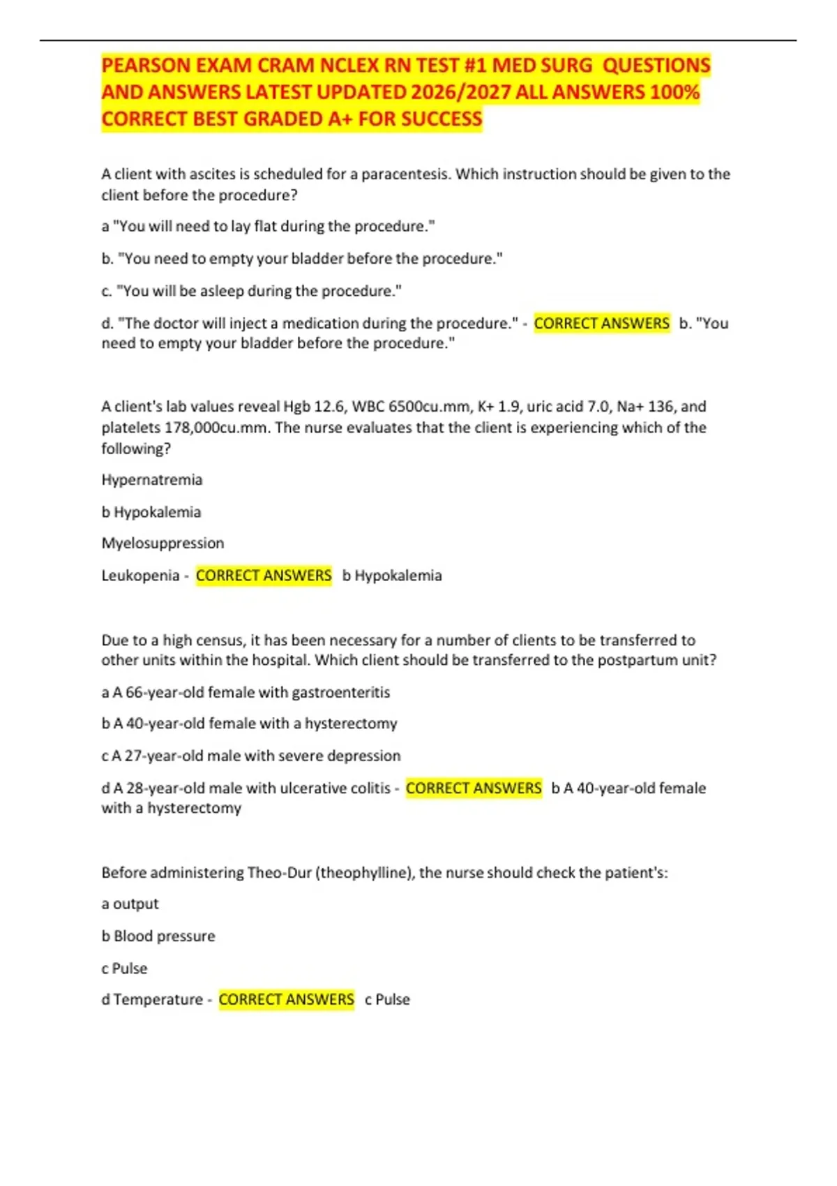 ,PEARSON EXAM CRAM NCLEX RN TEST #1 MED SURG QUESTIONS