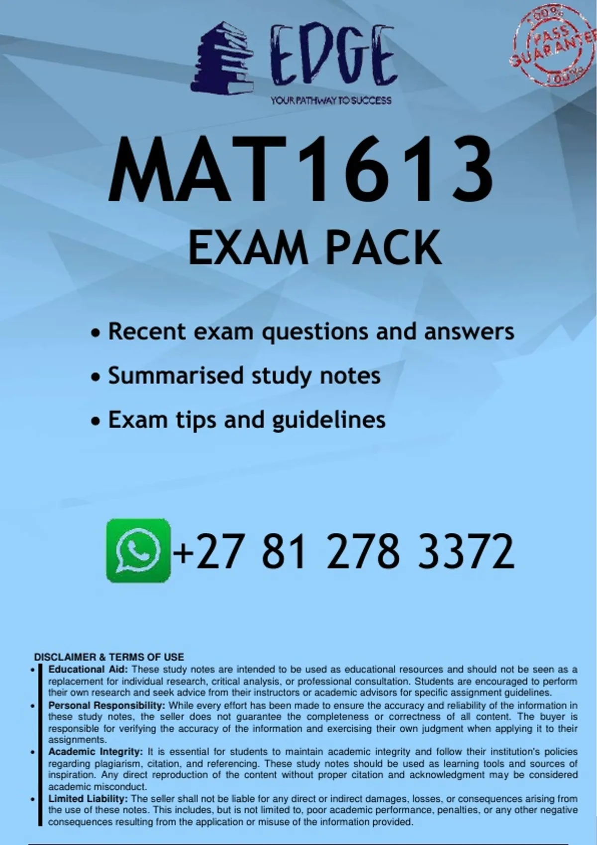 Well-structured MAT1613 EXAM PREPARATION PACK - DISTINCTION GUARANTEED. Contains recent exam questions and answers, and Summarised study notes. All you need to pass the 2026 EXAMS