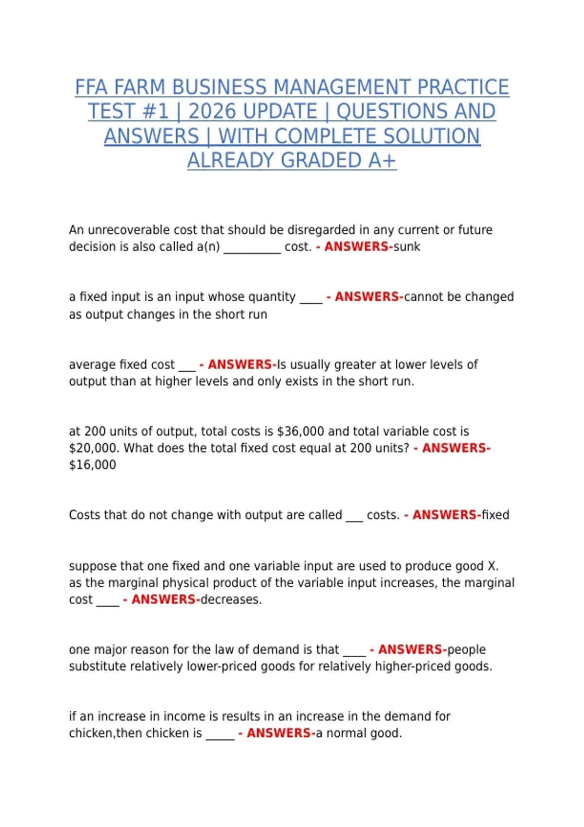FFA FARM BUSINESS MANAGEMENT PRACTICE TEST #1 | 2026 UPDATE | QUESTIONS AND ANSWERS | WITH COMPLETE SOLUTION ALREADY GRADED A+