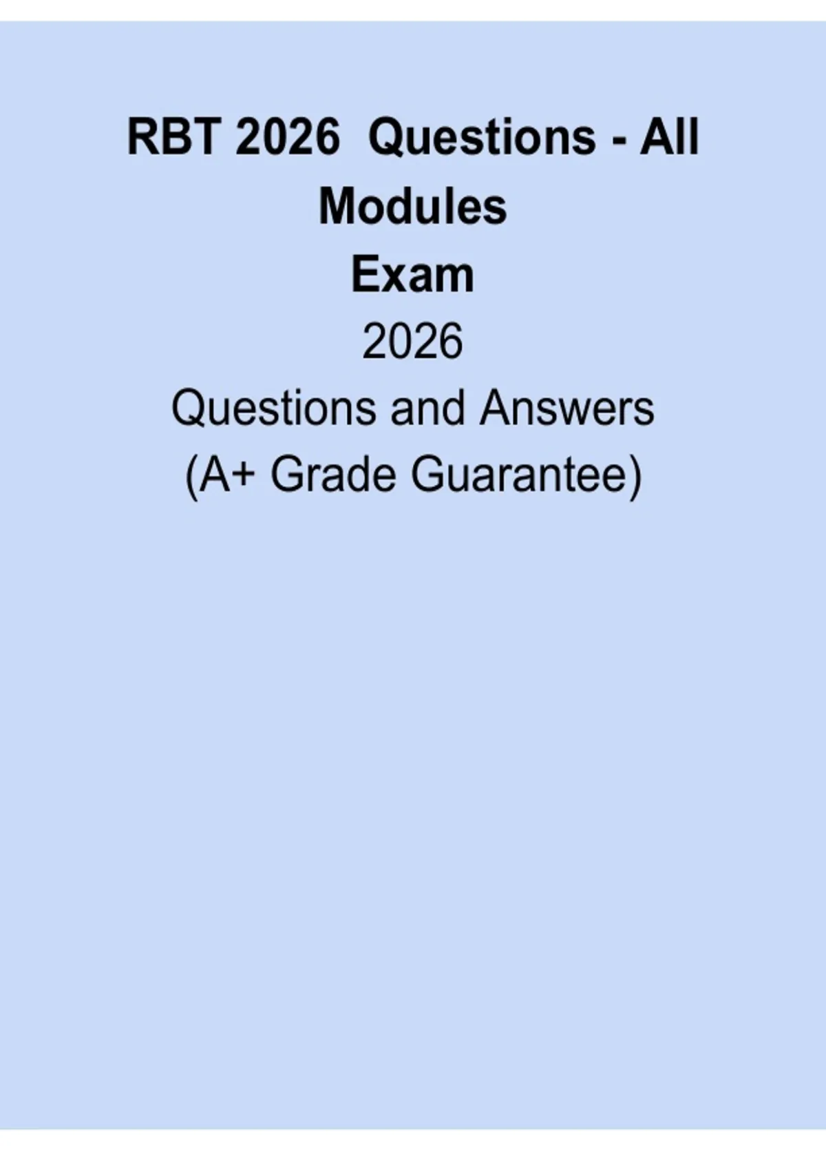 RBT 2026 Exam Questions – All Modules is a comprehensive question bank designed to help candidates prepare for the Registered Behavior Technician certification exam across all required content areas. This practice set covers ABA foundational concepts, measurement, assessment, skill acquisition, behavior reduction, documentation, ethics, and professional conduct aligned with the RBT Task List and current exam standards. Ideal for active recall and exam readiness, this resource helps candidates identify knowledge gaps, strengthen understanding, and approach the 2026 RBT exam with confidence.