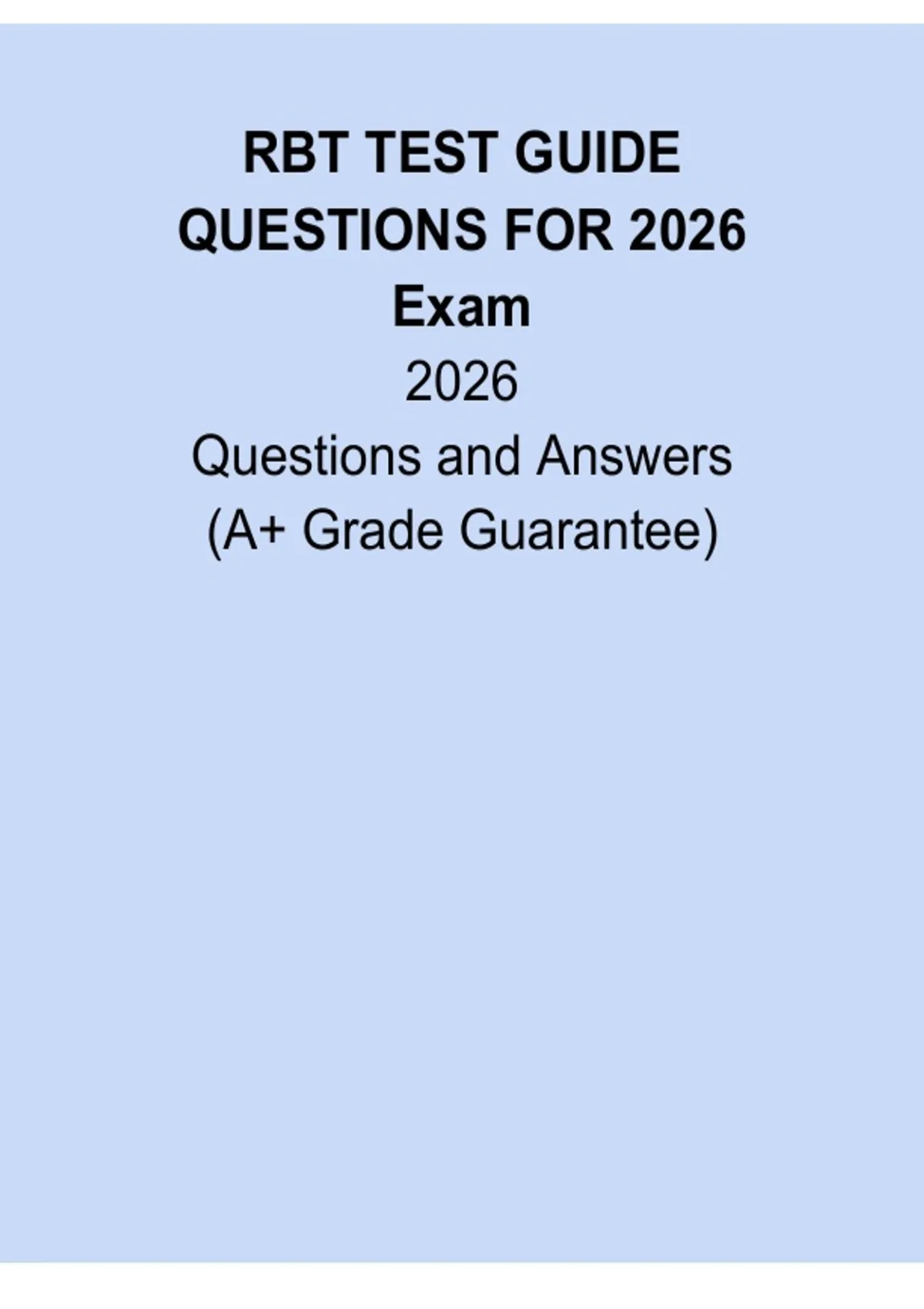 RBT Test Guide Questions for 2026 Exam is a targeted practice resource designed to help candidates prepare effectively for the Registered Behavior Technician certification exam. This question-based guide covers all RBT Task List modules, including ABA principles, measurement, assessment, skill acquisition, behavior reduction, documentation, ethics, and professional conduct, aligned with current testing standards. Ideal for guided practice .
