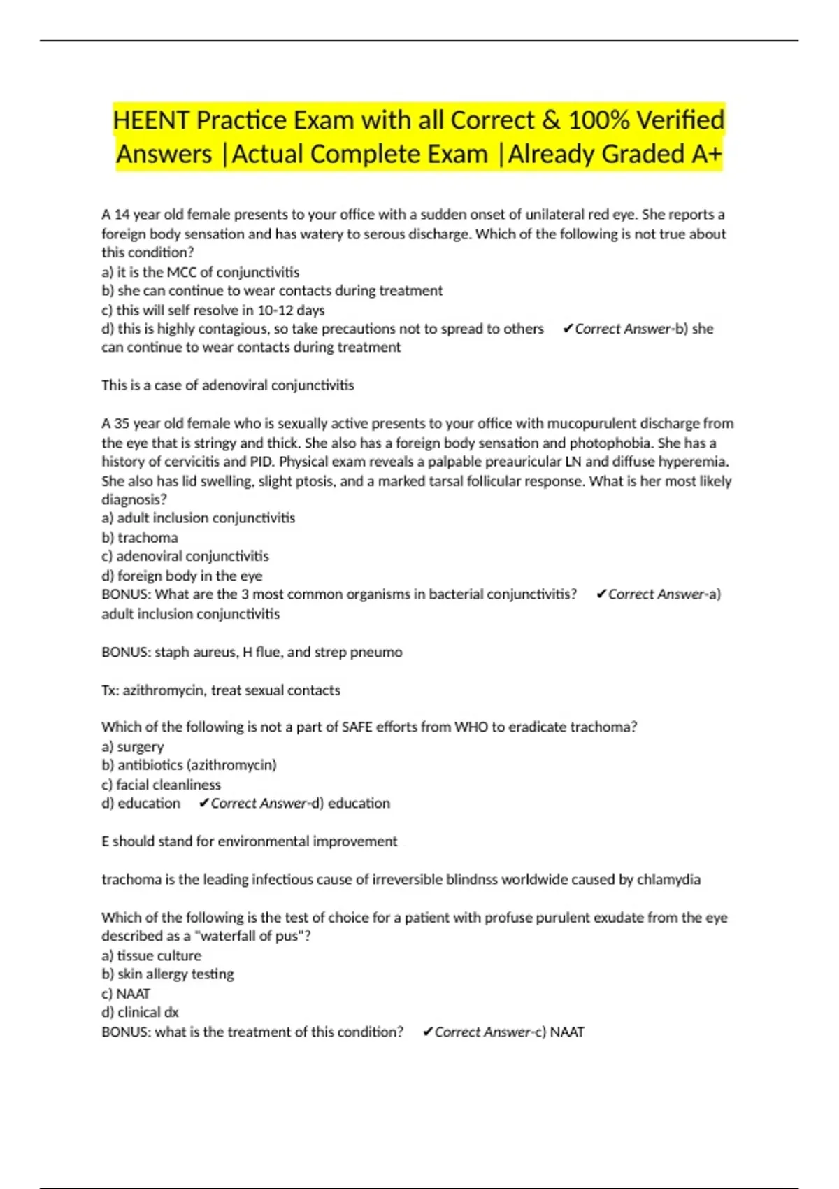 HEENT Practice Exam with all Correct & 100% Verified Answers |Actual Complete Exam |Already Graded A+