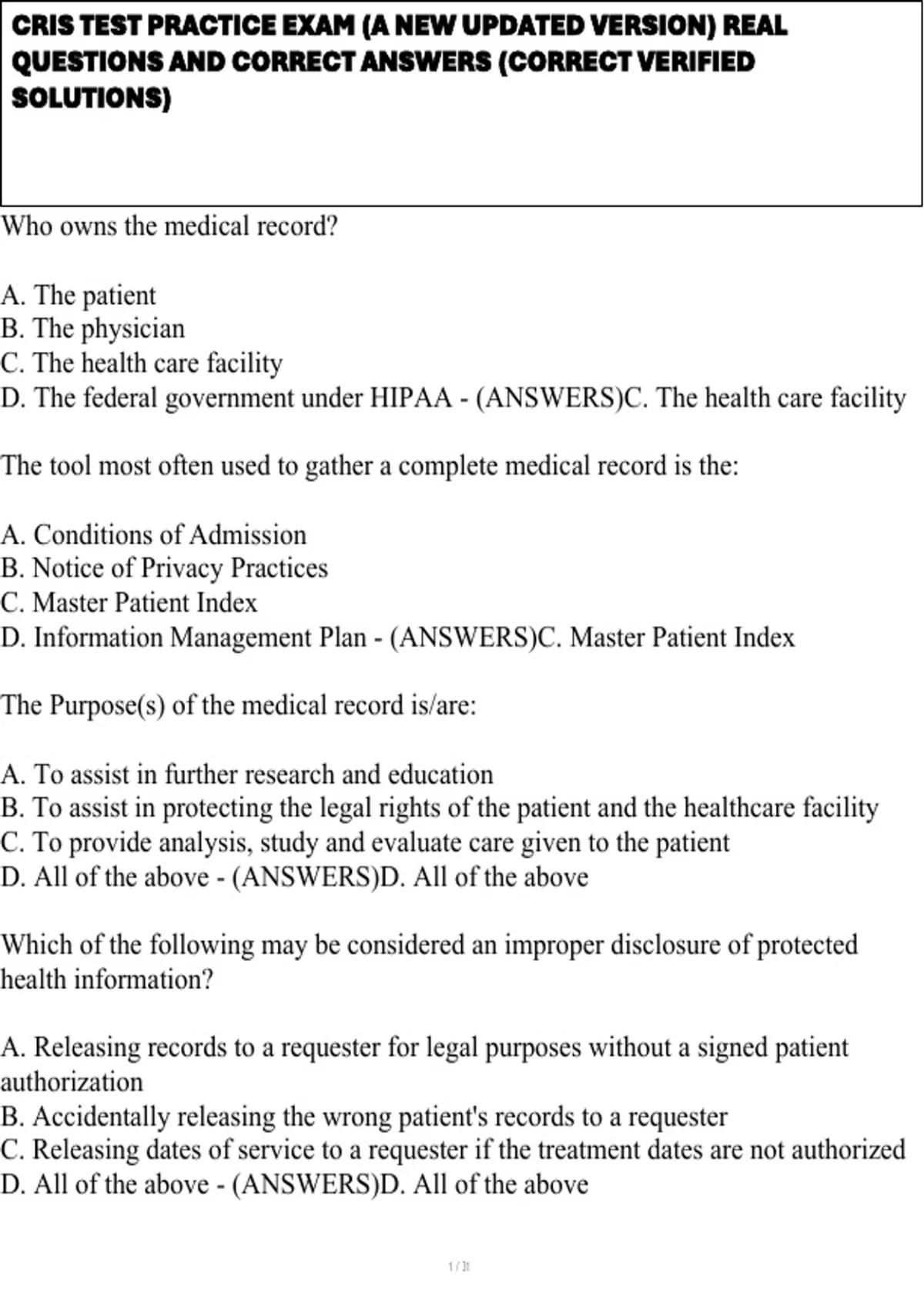 CRIS TEST PRACTICE EXAM (A NEW UPDATED VERSION) REAL