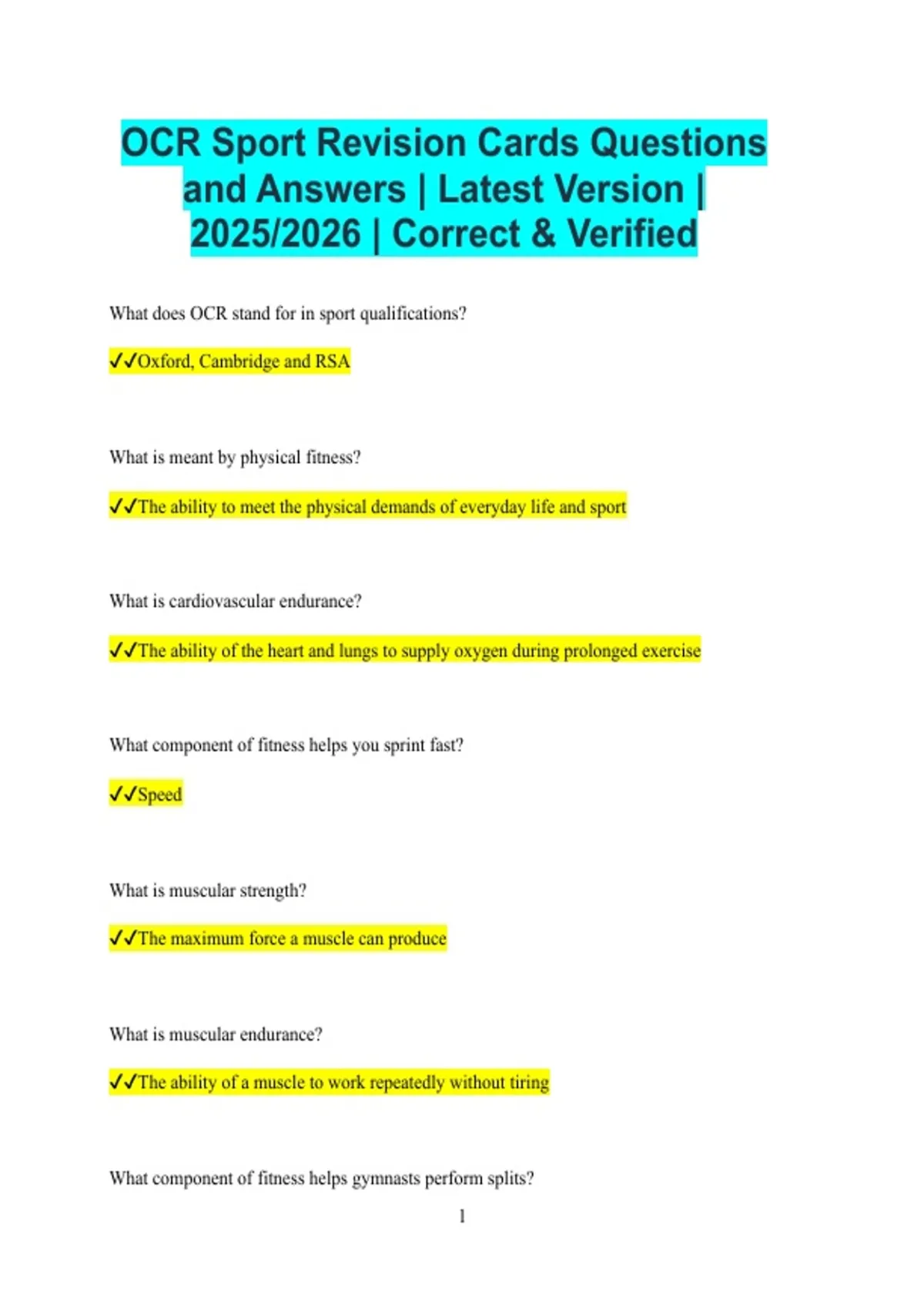 OCR Sport Revision Cards Questions and Answers | Latest Version | 2025/2026 | Correct & Verified What does OCR stand for in sport qualifications? Oxford, Cambridge and RSA What is meant by physical fitness? The ability to meet the physical demands of everyday life and sport What is cardiovascular endurance? The ability of the heart and lungs to supply oxygen during prolonged exercise What component of fitness helps you sprint fast? Speed What is muscular strength? The maximum force a muscle can produce What is muscular endurance? The ability of a muscle to work repeatedly without tiring What component of fitness helps gymnasts perform splits? 2 Flexibility What is agility? The ability to change direction quickly while maintaining control What does coordination involve? Using different body parts together smoothly What is balance? The ability to maintain stability What is power in sport? Strength combined with speed What is reaction time? The time taken to respond to a stimulus What is health-related fitness? Fitness linked to overall health and wellbeing What is skill-related fitness? Fitness linked to performance in sport 3 What type of training improves cardiovascular endurance? Continuous training What is interval training? Training that alternates between high and low intensity What is circuit training? A series of exercises performed at different stations What is the purpose of a warm-up? To prepare the body for exercise and reduce injury risk What is the purpose of a cool-down? To help the body recover after exercise What is a balanced diet? A diet that provides all nutrients in correct proportions What nutrient is the main source of energy? Carbohydrates 4 What nutrient helps repair muscles? Protein What nutrient provides insulation and energy storage?
