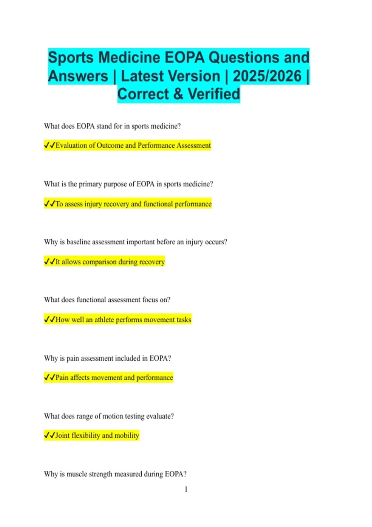 Sports Medicine EOPA Questions and Answers | Latest Version | 2025/2026 | Correct & Verified What does EOPA stand for in sports medicine? Evaluation of Outcome and Performance Assessment What is the primary purpose of EOPA in sports medicine? To assess injury recovery and functional performance Why is baseline assessment important before an injury occurs? It allows comparison during recovery What does functional assessment focus on? How well an athlete performs movement tasks Why is pain assessment included in EOPA? Pain affects movement and performance What does range of motion testing evaluate? Joint flexibility and mobility Why is muscle strength measured during EOPA? 2 To identify weakness affecting performance What does balance testing help determine? Risk of falls or re-injury Why are sport-specific tests used in EOPA? To reflect real performance demands What does swelling indicate during recovery assessment? Ongoing inflammation or injury Why is gait analysis important after lower limb injury? To detect abnormal walking patterns What does proprioception assessment measure? Body awareness and joint position sense Why is cardiovascular endurance assessed during rehabilitation? To ensure fitness levels are adequate What does functional symmetry refer to? Equal performance between limbs 3 Why is flexibility assessment repeated over time? To track progress in recovery What does delayed pain after activity suggest? Incomplete tissue healing Why is athlete feedback important in EOPA? It provides subjective recovery information What does strength imbalance increase risk of? Re-injury Why is reaction time assessed in some sports? Quick responses are performance-critical What does joint stability testing evaluate? Ability of a joint to maintain alignment Why is posture assessment included in EOPA? Poor posture affects injury risk 4 What does endurance testing measure? Ability to sustain activity Why are agility tests used in return-to-play decisions? They reflect rapid directional changes What does muscle tightness indicate? Reduced flexibility or overuse Why is core stability assessed? It supports efficient movement What does reduced power output suggest? Incomplete neuromuscular recovery Why is speed testing important in EOPA? Speed is essential for many sports What does asymmetrical movement indicate? Compensation for weakness or pain Why is load tolerance assessed? 5 To ensure tissues can handle stress What does fatigue assessment help identify? Risk of performance decline Why are repeated measures important in EOPA? They show trends over time What does functional pain-free movement indicate?
