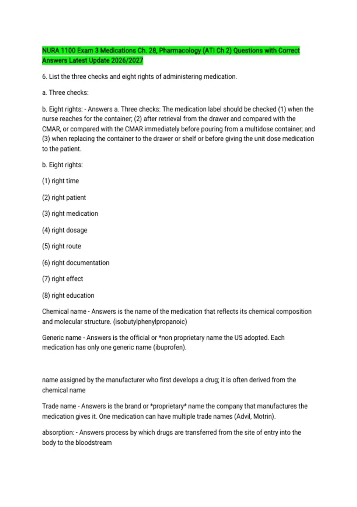 NURA 1100 Exam 3 Medications Ch. 28, Pharmacology (ATI Ch 2) Questions with Correct Answers Latest Update 2026/2027 6. List the three checks and eight rights of administering medication. a. Three checks: b. Eight rights: - Answers a. Three checks: The medication label should be checked (1) when the nurse reaches for the container; (2) after retrieval from the drawer and compared with the CMAR, or compared with the CMAR immediately before pouring from a multidose container; and (3) when replacing the container to the drawer or shelf or before giving the unit dose medication to the patient. b. Eight rights: (1) right time (2) right patient (3) right medication (4) right dosage (5) right route (6) right documentation (7) right effect (8) right education Chemical name - Answers is the name of the medication that reflects its chemical composition and molecular structure. (isobutylphenylpropanoic) Generic name - Answers is the official or *non proprietary name the US adopted. Each medication has only one generic name (ibuprofen). name assigned by the manufacturer who first develops a drug; it is often derived from the chemical name Trade name - Answers is the brand or *proprietary* name the company that manufactures the medication gives it. One medication can have multiple trade names (Advil, Motrin). absorption: - Answers process by which drugs are transferred from the site of entry into the body to the bloodstream adverse drug effect: - Answers undesirable effects other than the intended therapeutic effect of a drug allergic effect: - Answers immune system response that occurs when the body interprets an administered drug as a foreign substance and forms antibodies against the drug anaphylaxis: - Answers severe reaction occurring immediately after exposure to a drug; characterized by respiratory distress and vascular collapse antagonist effect: - Answers combined effect of two or more drugs that produces less than the effect of each drug alone cumulative effect: - Answers condition that occurs when the body cannot metabolize a drug before additional doses are administered distribution: - Answers movement of drugs by the circulatory system to the site of action drug tolerance: - Answers tendency of the body to become accustomed to a drug over time; larger doses are required to produce the desired effects ethnopharmacology: - Answers study of the effect of ethnicity on responses to prescribed medication, especially drug absorption, metabolism, distribution, and excretion excretion: - Answers removal of a drug from the body half-life: - Answers the amount of time it takes for half a dose of a drug to be eliminated from the body idiosyncratic effect: - Answers unusual, unexpected response to a drug that may manifest itself by overresponse, underresponse, or response different from the expected outcome inhalation: - Answers (1) act of breathing in; synonym for inspiration; (2) administration of a drug in solution via the respiratory tract intradermal injection: - Answers injection placed just below the epidermis intramuscular injection: - Answers an injection into deep muscle tissue, usually of the buttock, thigh, or upper arm intravenous route: - Answers injection of a solution into the vein metabolism: - Answers (1) chemical changes in the body by which energy is provided; (2) breakdown of a drug to an inactive form; also referred to as biotransformation mini-infusion pump: - Answers battery-operated pump for intermittent infusion allowing medication mixed in a syringe to be connected to the primary line and delivered by mechanical pressure applied to the syringe plunger official name: - Answers name by which a drug is identified in official publications parenteral: - Answers outside of intestines or alimentary canal; popularly used to refer to injection routes pharmacodynamic: - Answers process by which drugs alter cell physiology and affect the body pharmacokinetics: - Answers movement of drug molecules in the body in relation to the drug's absorption, distribution, metabolism, and excretion pharmacology: - Answers study of actions of chemicals on living organisms pharmacotherapeutics: - Answers dynamic that achieves the desired therapeutic effect of the drug without causing other undesirable effects placebo: - Answers Latin word meaning, "I shall please"; an inactive substance that gives satisfaction to the person using it PRN order: - Answers "as needed" order for medication stat order: - Answers single order carried out immediately subcutaneous injection: - Answers injection into the subcutaneous tissue that lies between the epidermis and the muscle synergistic effect: - Answers combined effect of two or more drugs is greater than the effect of each drug alone teratogenic: - Answers known to have potential to cause developmental defects in the embryo or fetus therapeutic range: - Answers that concentration of drug in the blood serum that produces the desired effect without causing toxicity toxic effect: - Answers specific groups of symptoms related to drug therapy that carry risk for permanent damage or death trade name: - Answers drug name selected and trademarked by the company marketing the drug; also called brand name or proprietary name trough level: - Answers the point when a drug is at its lowest concentration. Normally ordered for patient's taking vacomycin, a blood level drawn 30 prior to the next dose. vial: - Answers glass bottle with self-sealing stopper through which medication is removed; may be single or multiple dose volume-control administration set: - Answers intermittent intravenous medication infusion