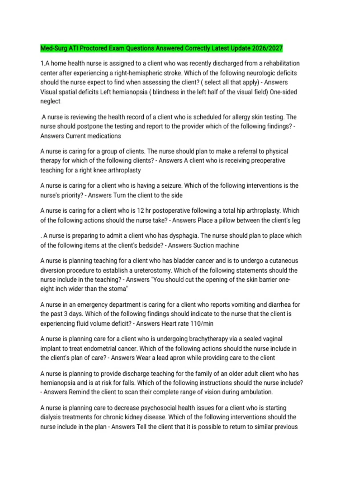 Med-Surg ATI Proctored Exam Questions Answered Correctly Latest Update 2026/2027 1.A home health nurse is assigned to a client who was recently discharged from a rehabilitation center after experiencing a right-hemispheric stroke. Which of the following neurologic deficits should the nurse expect to find when assessing the client? ( select all that apply) - Answers Visual spatial deficits Left hemianopsia ( blindness in the left half of the visual field) One-sided neglect .A nurse is reviewing the health record of a client who is scheduled for allergy skin testing. The nurse should postpone the testing and report to the provider which of the following findings? - Answers Current medications A nurse is caring for a group of clients. The nurse should plan to make a referral to physical therapy for which of the following clients? - Answers A client who is receiving preoperative teaching for a right knee arthroplasty A nurse is caring for a client who is having a seizure. Which of the following interventions is the nurse's priority? - Answers Turn the client to the side A nurse is caring for a client who is 12 hr postoperative following a total hip arthroplasty. Which of the following actions should the nurse take? - Answers Place a pillow between the client's leg . A nurse is preparing to admit a client who has dysphagia. The nurse should plan to place which of the following items at the client's bedside? - Answers Suction machine A nurse is planning teaching for a client who has bladder cancer and is to undergo a cutaneous diversion procedure to establish a ureterostomy. Which of the following statements should the nurse include in the teaching? - Answers "You should cut the opening of the skin barrier one-eight inch wider than the stoma" A nurse in an emergency department is caring for a client who reports vomiting and diarrhea for the past 3 days. Which of the following findings should indicate to the nurse that the client is experiencing fluid volume deficit? - Answers Heart rate 110/min A nurse is planning care for a client who is undergoing brachytherapy via a sealed vaginal implant to treat endometrial cancer. Which of the following actions should the nurse include in the client's plan of care? - Answers Wear a lead apron while providing care to the client A nurse is planning to provide discharge teaching for the family of an older adult client who has hemianopsia and is at risk for falls. Which of the following instructions should the nurse include? - Answers Remind the client to scan their complete range of vision during ambulation. A nurse is planning care to decrease psychosocial health issues for a client who is starting dialysis treatments for chronic kidney disease. Which of the following interventions should the nurse include in the plan - Answers Tell the client that it is possible to return to similar previous levels of activity A nurse is caring for a client who has a closed head injury and has an intraventricular catheter placed. Which of the following findings indicates that the client is experiencing increased intracranial pressure (ICP - Answers Sleepiness exhibited by the client Widening pulse pressure Decerebrated posturing An older adult client is brought to an emergency department by a family member. Which of the following assessment findings should cause the nurse to suspect that the client has hypertonic dehydration - Answers Urine specific gravity 1.045 .A nurse is caring for a client who has a prescription for enalapril. The nurse should identify which of the following findings as an adverse effect of the medication? - Answers Orthostatic hypotension .A nurse in a provider's office is caring for a client who requests sildenafil to treat erectile dysfunction. Which of the following statements should the nurse make? - Answers " You will not be able to use sildenafil if you are taking nitroglycerin A nurse is planning care for a client who has extensive burn injuries and is immunocompromised. Which of the following precautions should the nurse include in the plan of care to prevent a pseudomonas aeruginosa infection? - Answers Avoid placing plants or flowers in the client's room A nurse is teaching a class about client rights. Which of the following instructions should the nurse include? - Answers A client should sign an informed consent receiving a placebo during a research trial A nurse is caring for a client who is receiving morphine for daily dressing changes. The client tells the nurse, " I don't want any more morphine because I don't want to get addicted." Which of the following actions should the nurse take? - Answers Instruct the client on alternative therapies for pain reduction A nurse is preparing a client who has supraventricular tachycardia for elective cardioversion. Which of the following prescribed medications should the nurse instruct the client to withhold for 48 hr prior to cardioversion - Answers Digoxin A nurse is caring for a client 1 hr following a cardiac catheterization. The nurse notes the formation of a hematoma at the insertion site and a decreased pulse rate in the affected extremity. Which of the following interventions is the nurse's priority? - Answers Apply firm pressure to the insertion site A nurse is assessing a client who has graves' disease. Which of the following images should indicate to the nurse that the client has exophthalmos - Answers The nurse should identify an outward protrusion of the eyes as exophthalmos, a common finding of graves' disease. An overproduction of the thyroid hormone causes edema of the extraocular muscle and increa
