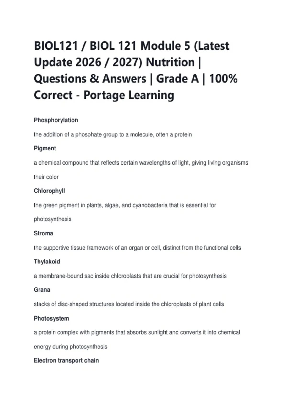 BIOL121 / BIOL 121 Module 5 (Latest Update 2026 / 2027) Nutrition | Questions & Answers | Grade A | 100% Correct - Portage Learning