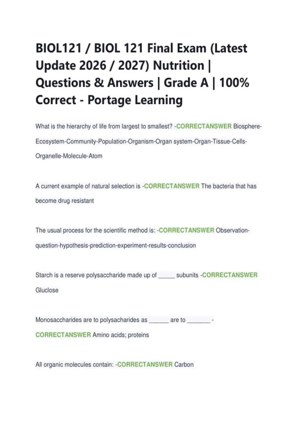 BIOL121 / BIOL 121 Final Exam (Latest Update 2026 / 2027) Nutrition | Questions & Answers | Grade A | 100% Correct - Portage Learning