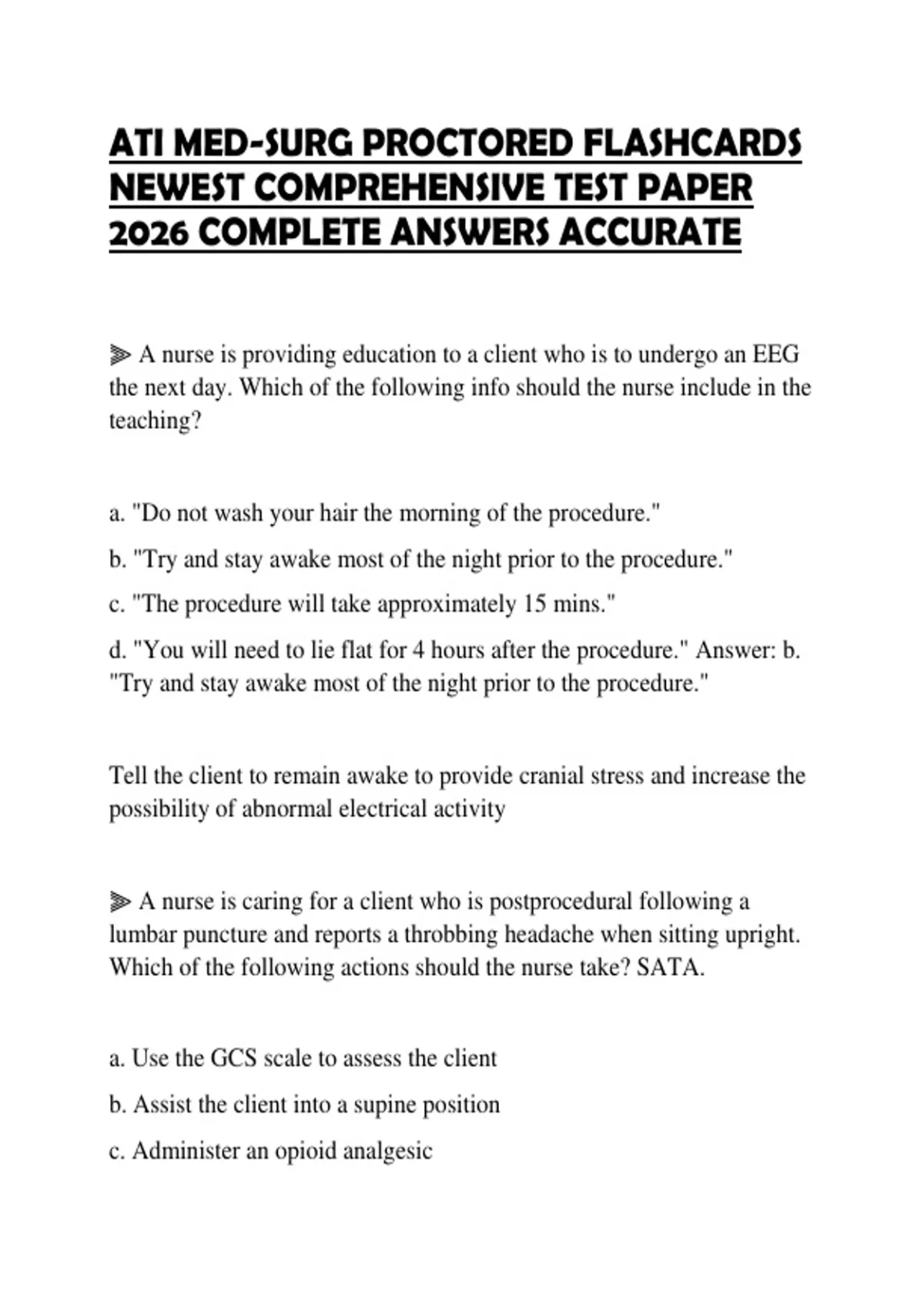 d. "You will need to lie flat for 4 hours after the procedure." Answer: b.