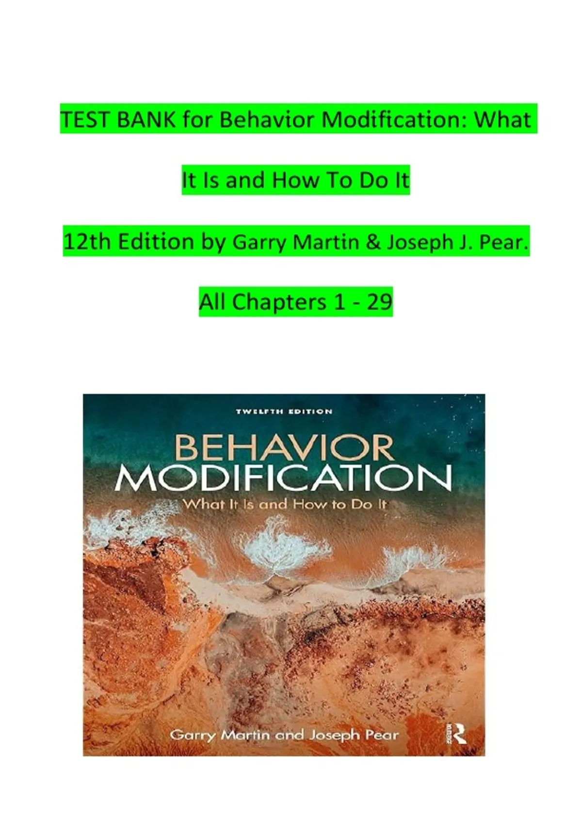 Complete test bank for Behavior Modification: What It Is and How To Do It, 12th Edition by Martin & Pear. Covers all chapters 1-29 for ABA, psychology, and counseling exam preparation and applied behavior analysis study.