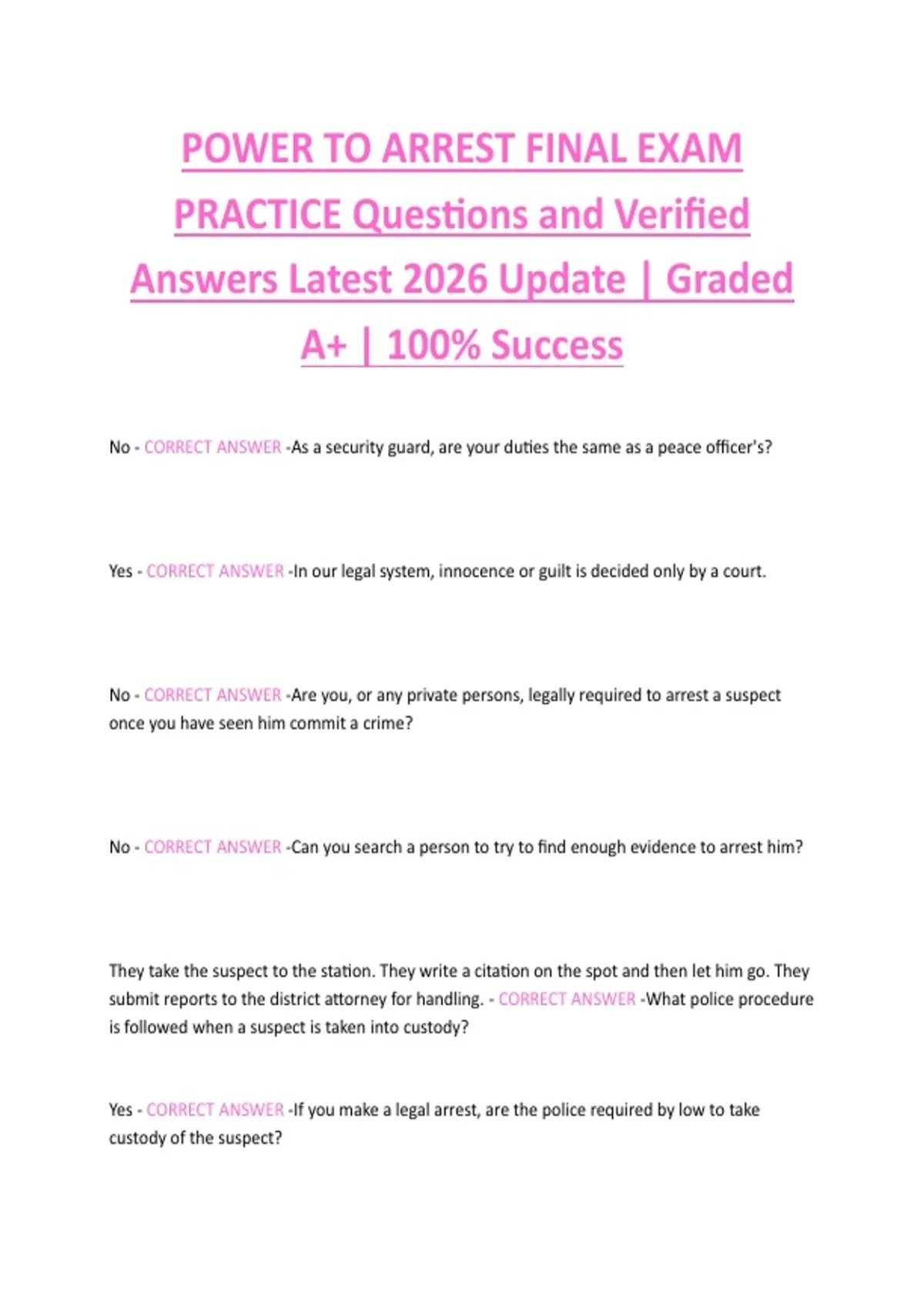 POWER TO ARREST FINAL EXAM PRACTICE Questions and Verified Answers Latest 2026 Update | Graded A+ | 100% Success