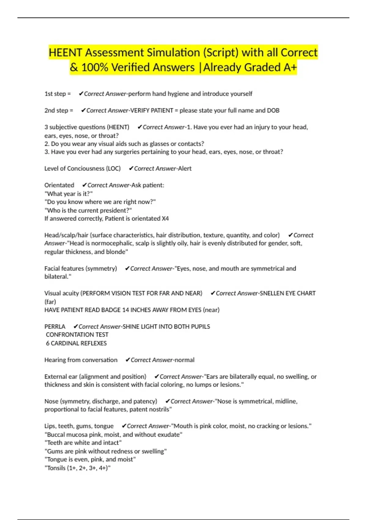 HEENT Assessment Simulation (Script) with all Correct & 100% Verified Answers |Already Graded A+