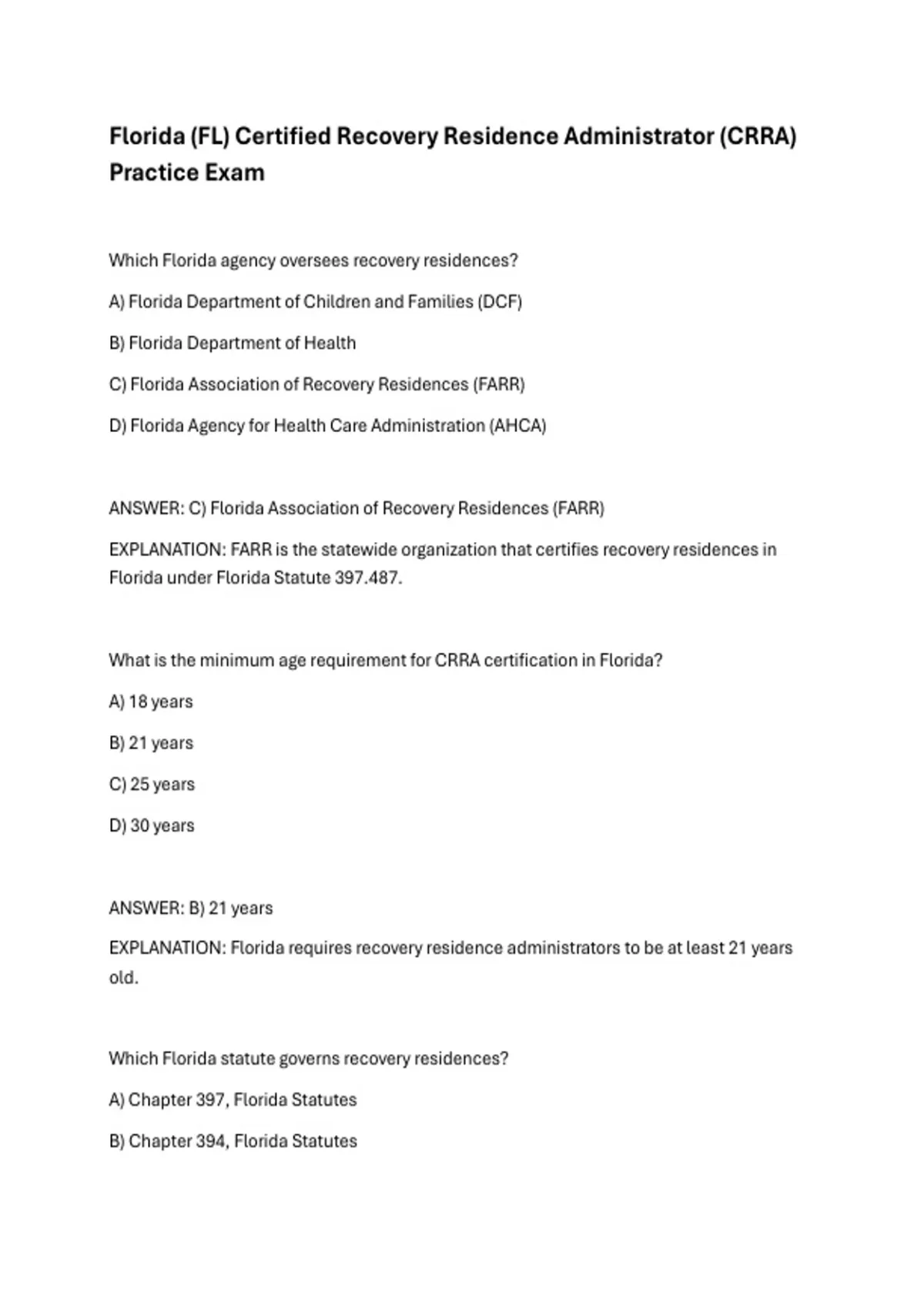 Florida (FL) Certified Recovery Residence Administrator (CRRA) Practice Exam