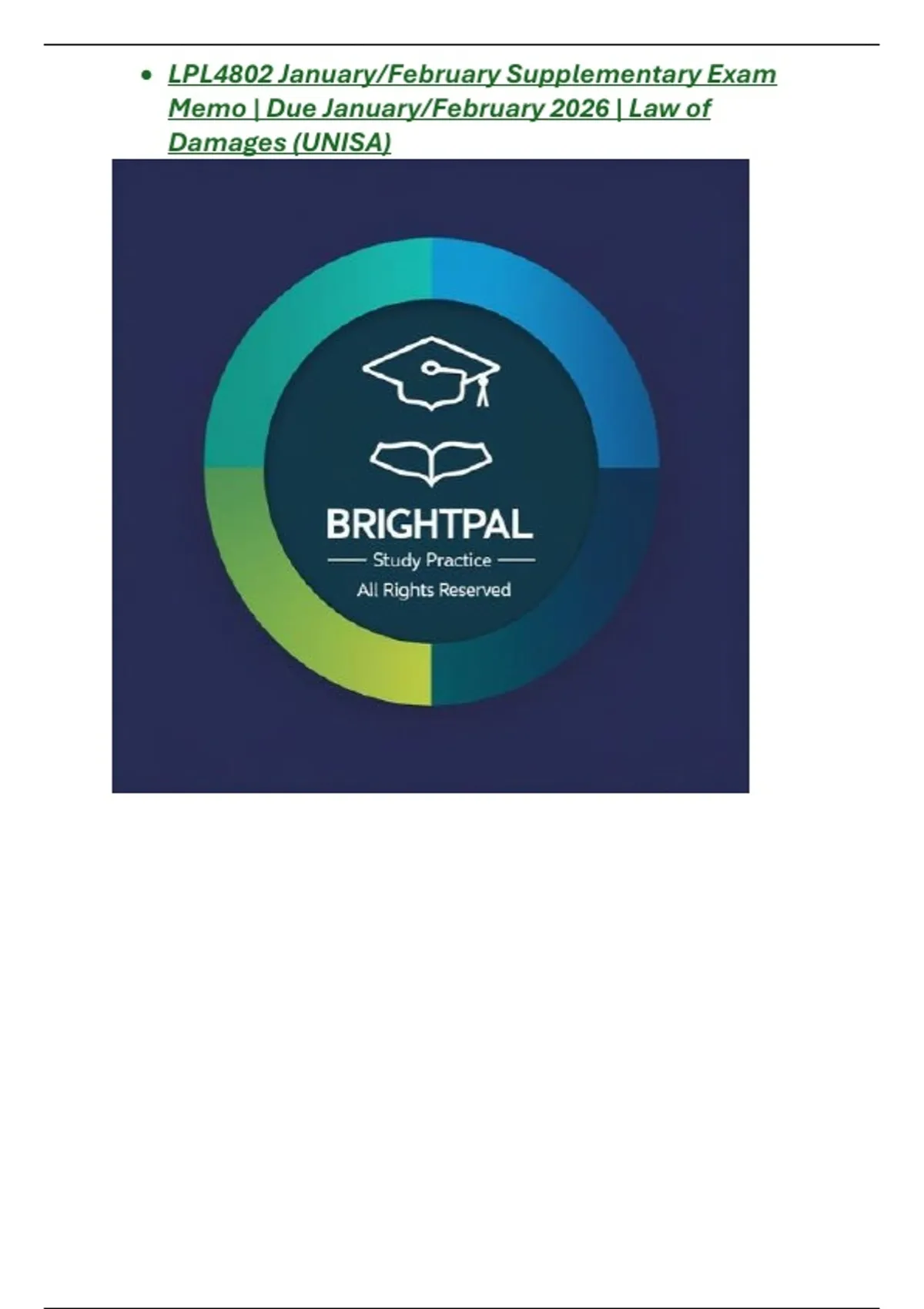 This LPL4802 Law of Damages Supplementary Exam Memo for the University of South Africa (UNISA) is fully updated for the January/February 2026 examination period and structured according to UNISA’s proven assessment standards. It covers essential topics including types of damages, principles of compensation, delictual and contractual claims, calculation of damages, remedies, and relevant South African case law. Designed for law students, this memo provides clear, concise, and exam-focused answers, helping learners understand complex legal concepts and perform confidently in the LPL4802 supplementary exam.