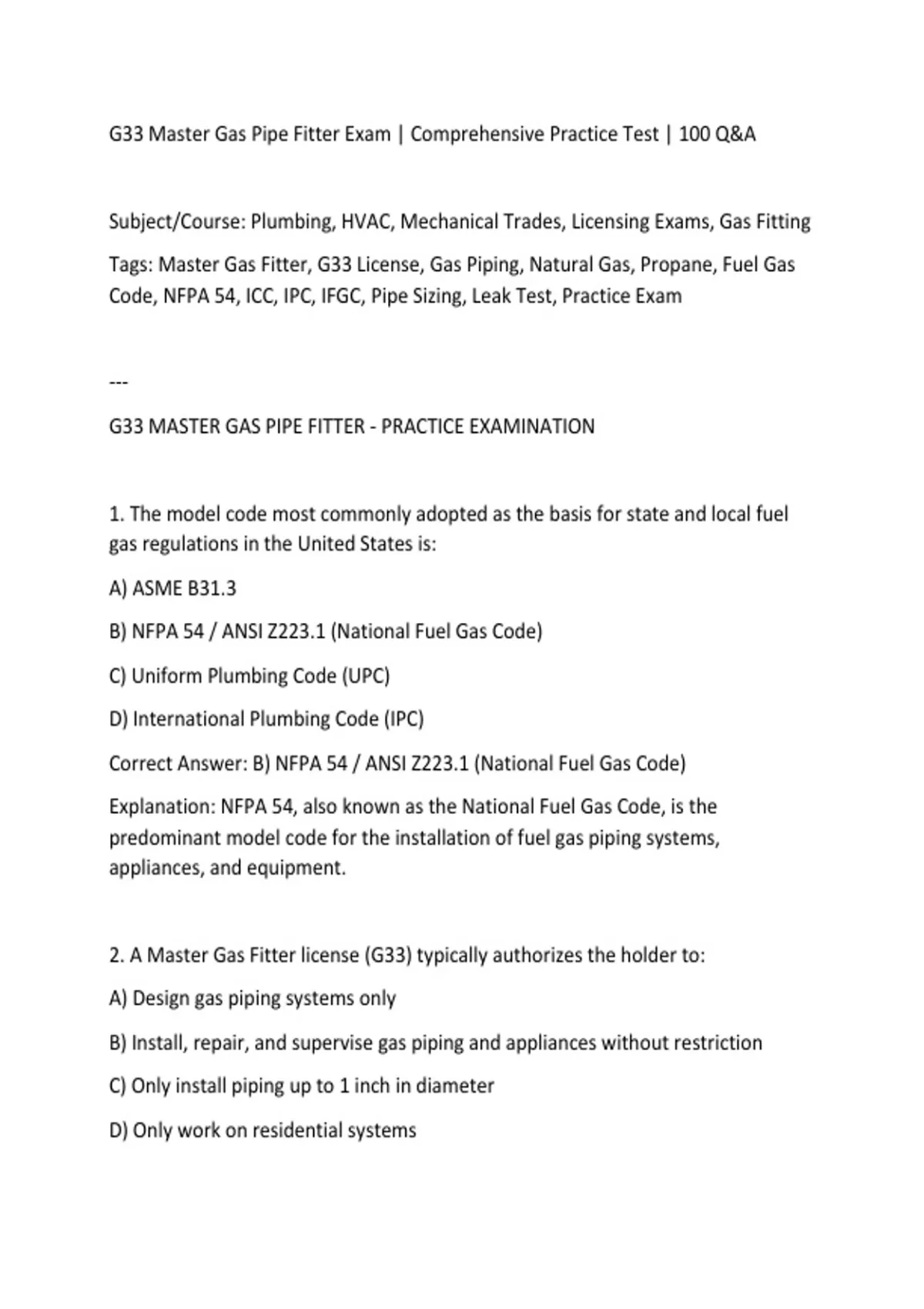 G33 Master Gas Pipe Fitter Exam | Comprehensive Practice Test | 100 Q&A Subject/Course: Plumbing, HVAC, Mechanical Trades, Licensing Exams, Gas Fitting Tags: Master Gas Fitter, G33 License, Gas Piping, Natural Gas, Propane, Fuel Gas Code, NFPA 54, ICC, IPC, IFGC, Pipe Sizing, Leak Test, Practice Exam